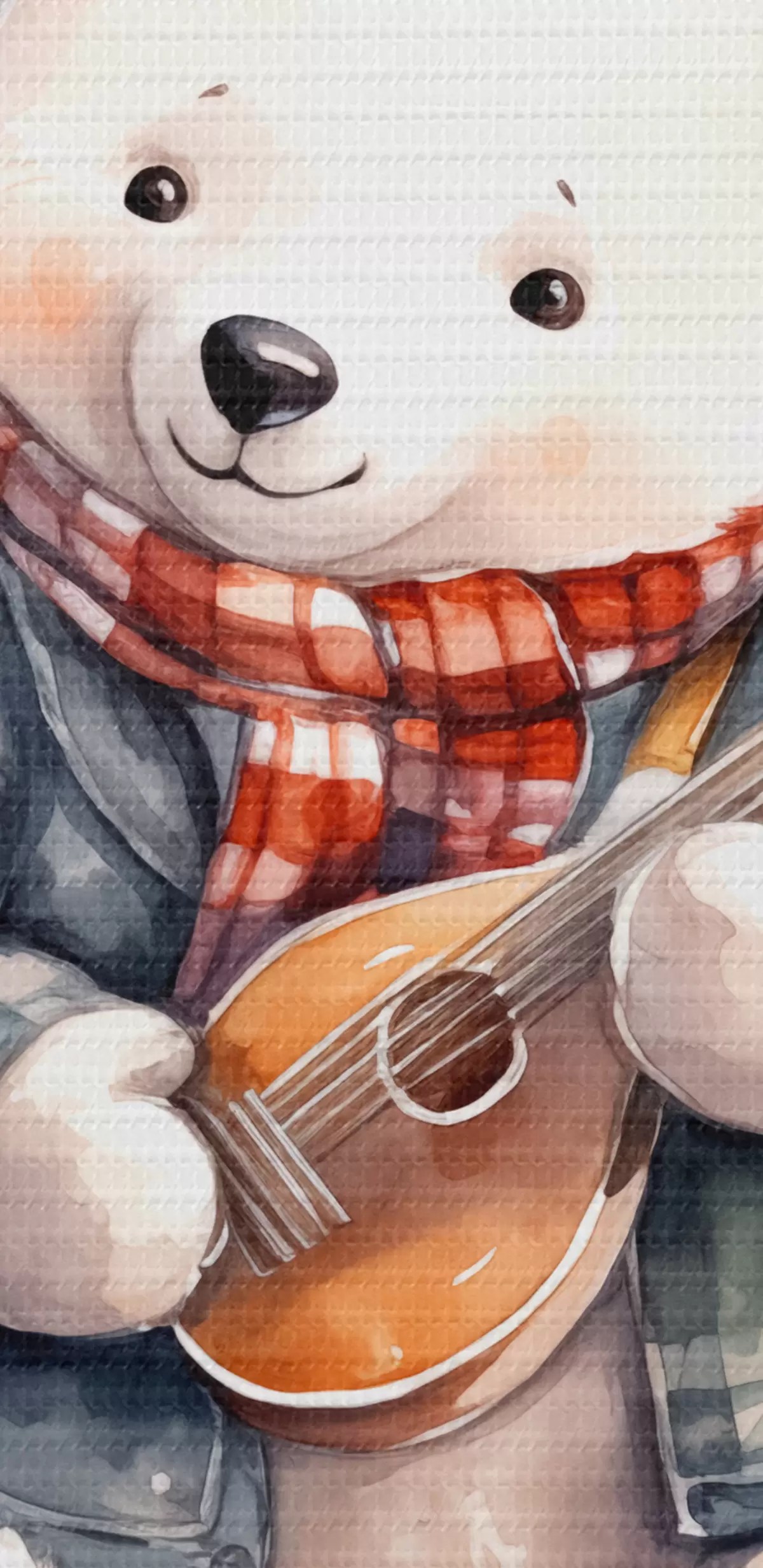 Картина Білий ведмідь музикант у синьому картатому костюмі та червоному шарфі грає на гітарі дитяча акварельна ілюстрація Арт. s39120