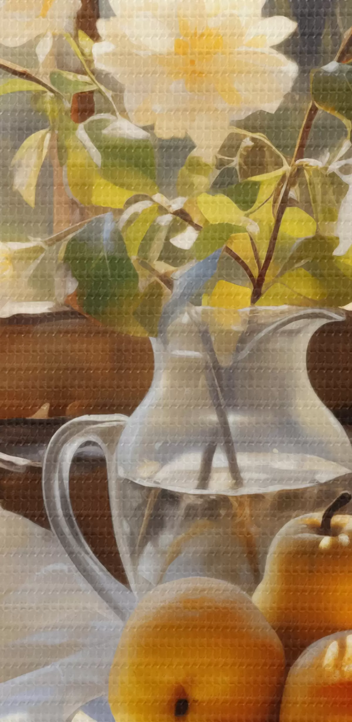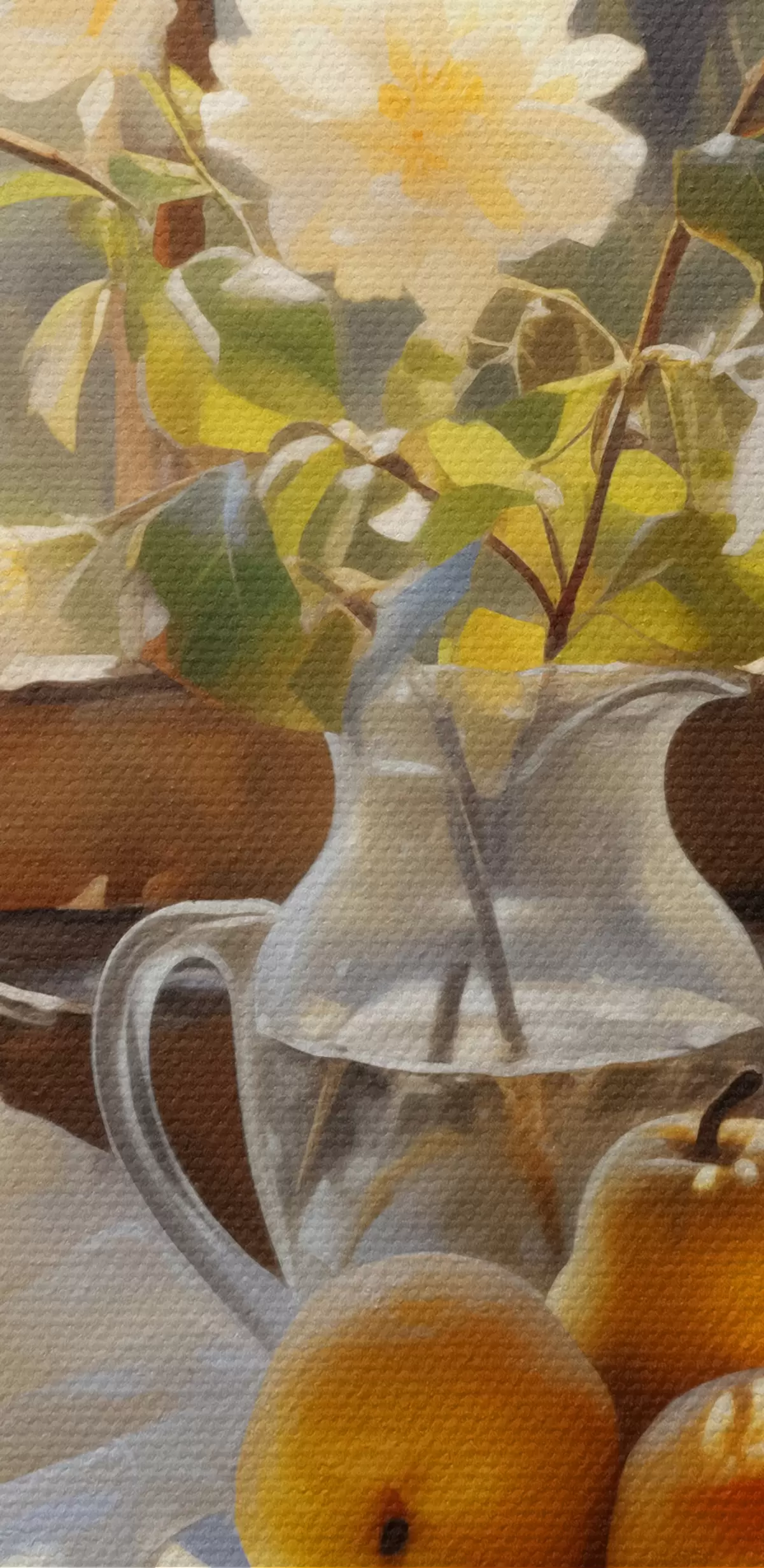 Картина Сільський натюрморт із жовтих стиглих груш на тарілці на столі біля вікна, білих троянд у скляному глечику, білих мереживних фіранок Арт. s39129