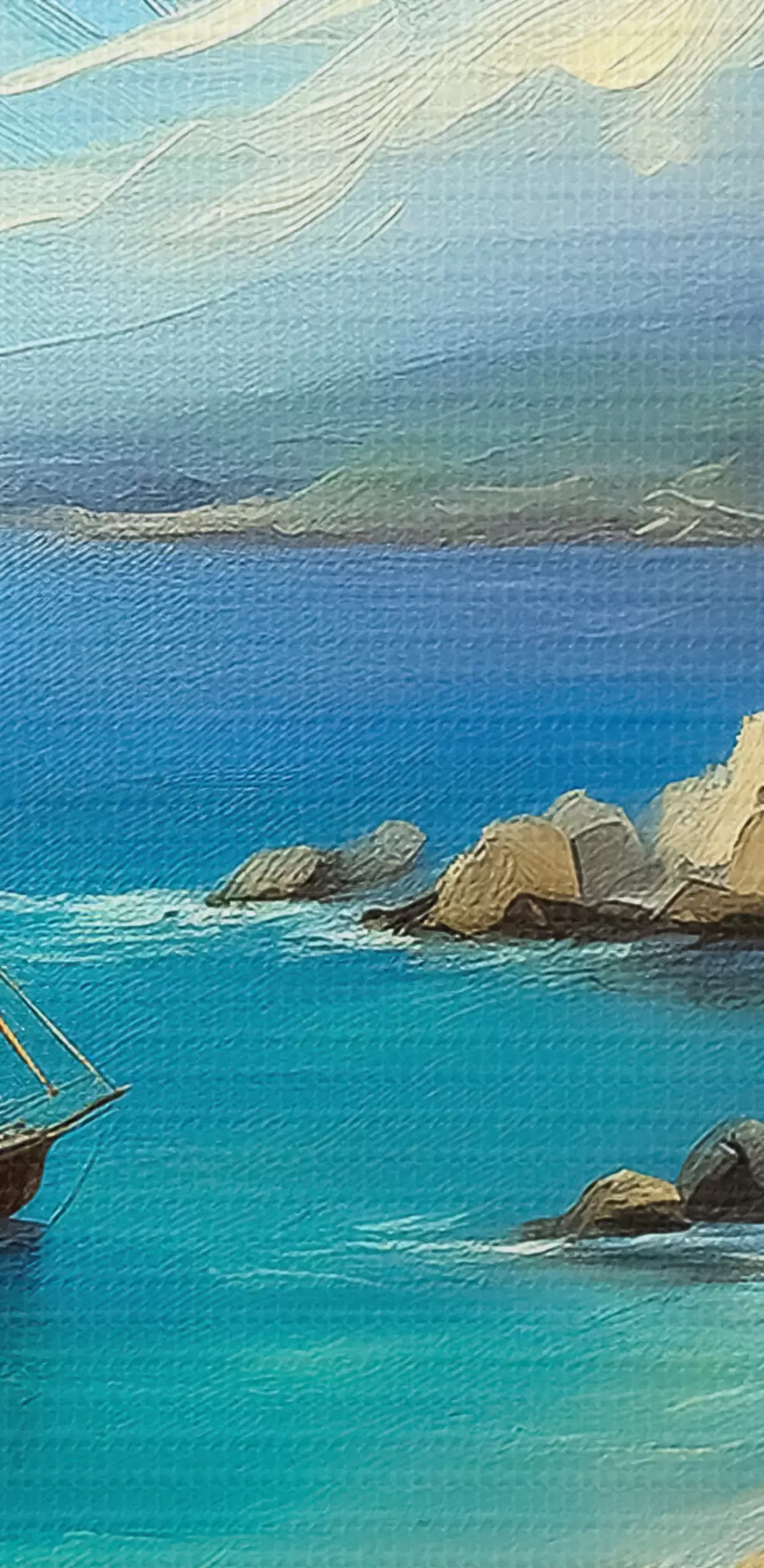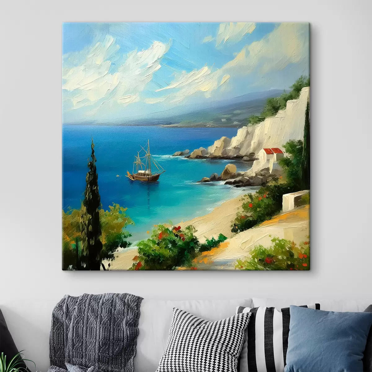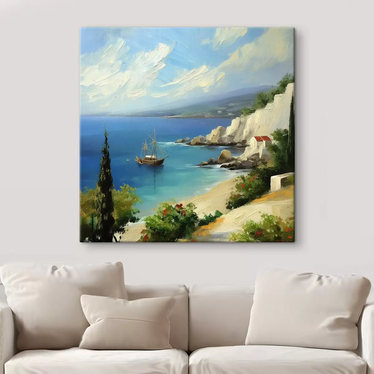 Картина Морське узбережжя Греції, корабель, блакитна вода, олійний живопис, літня природа, скелі, яскраві мазки s39425