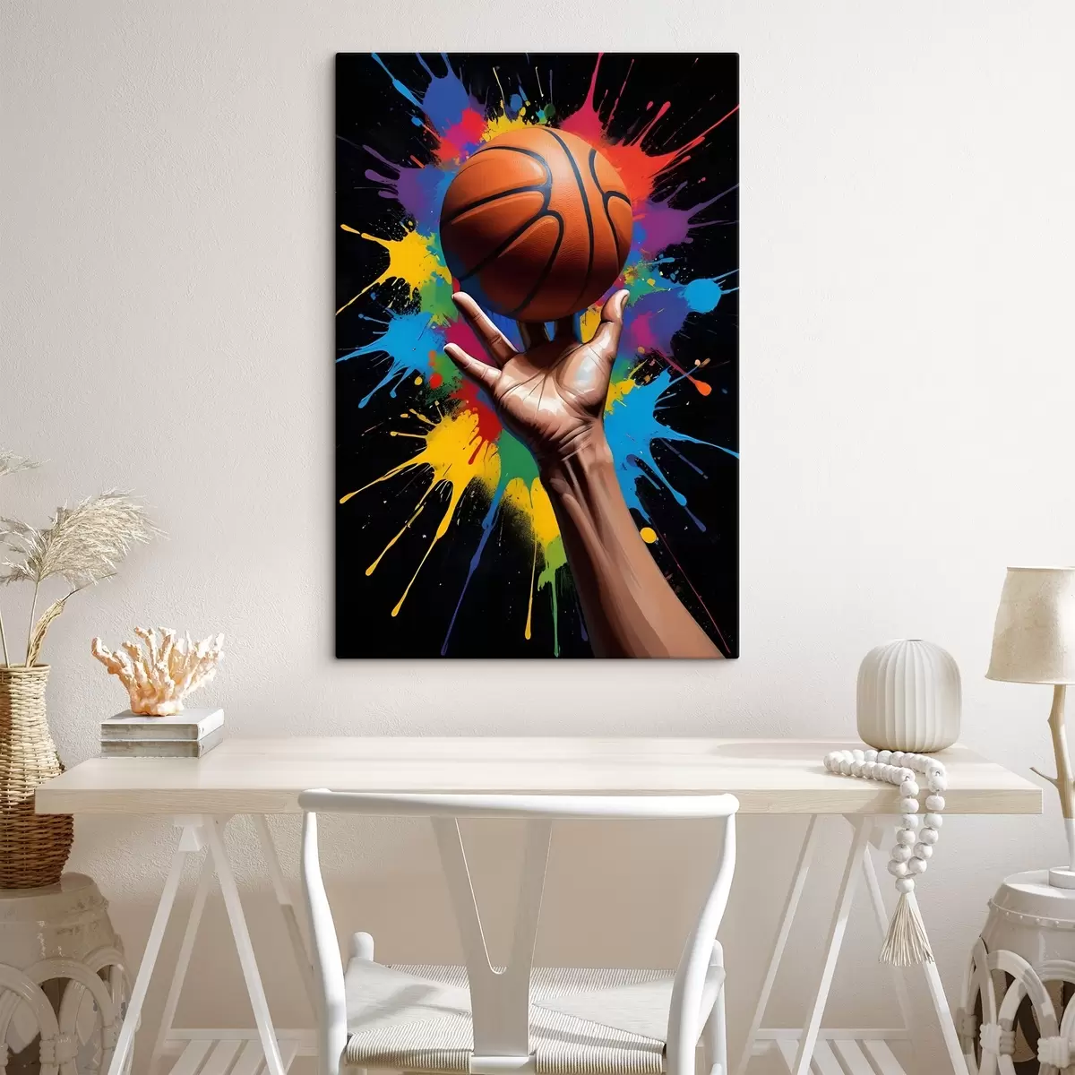Картина Рука, що тримає баскетбольний м'яч на фоні барвистих бризок фарби Арт. s39529