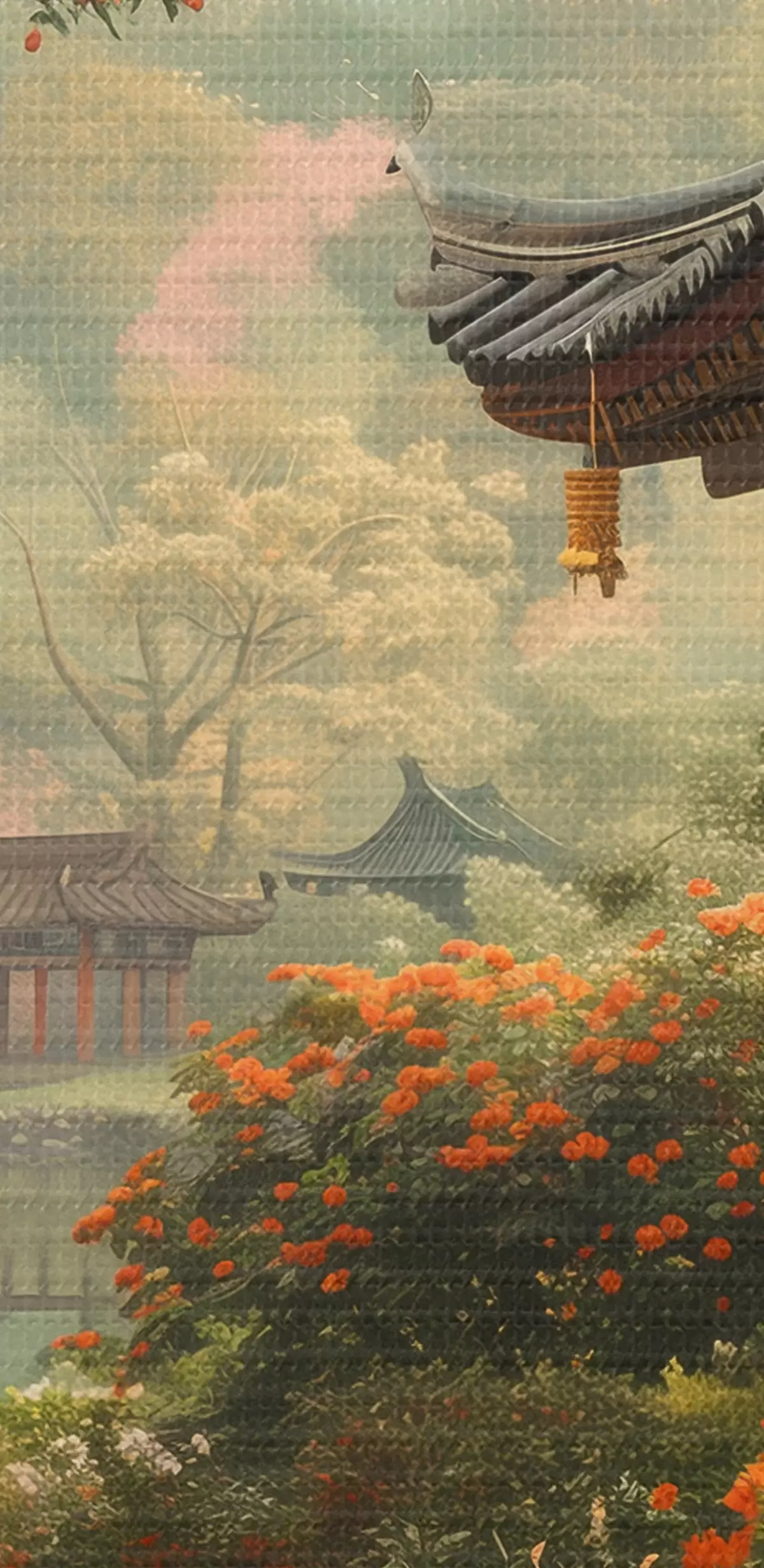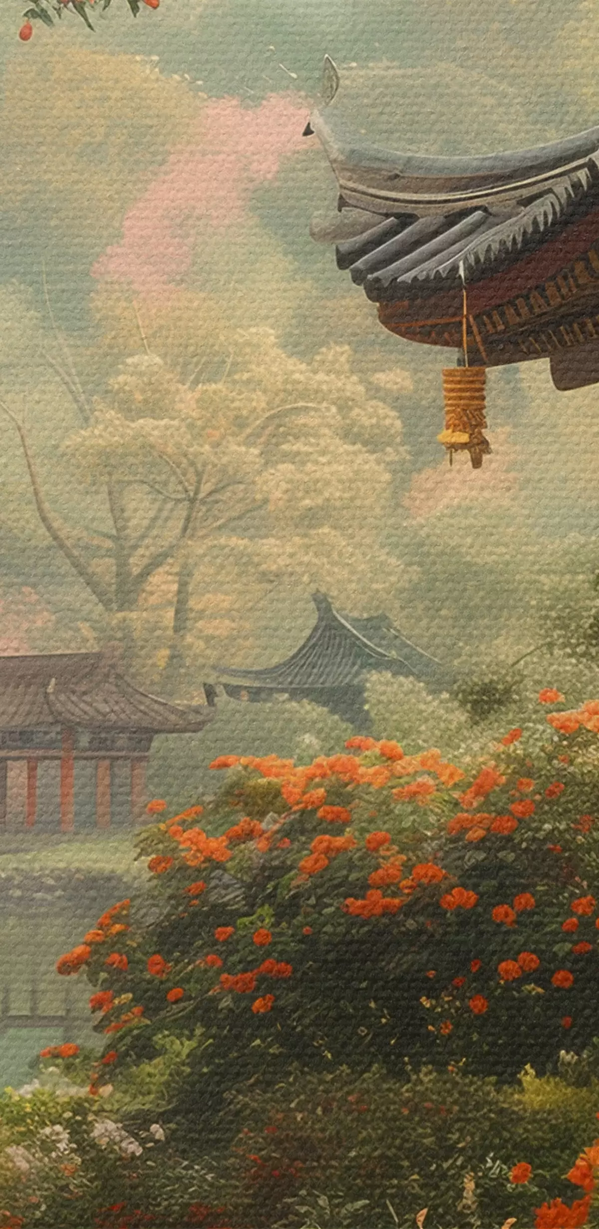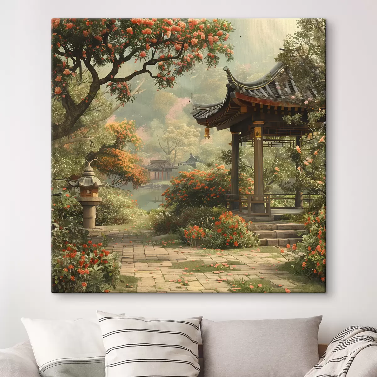 Картина Японський парк з квітучими деревами та квітами, ліс, садовий будинок, озеро Арт. s39772