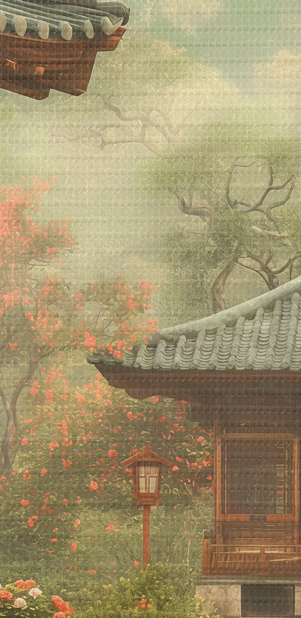 Картина Японський парк з квітучими деревами і квітами, ліс, дерев'яний будинок s39773