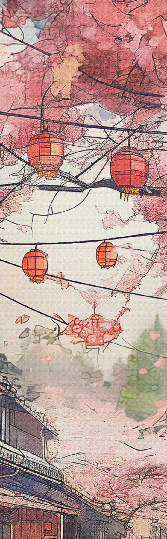 Картина Японська вулиця з квітучими вишневими деревами, східна архітектура, ліхтарі s39774