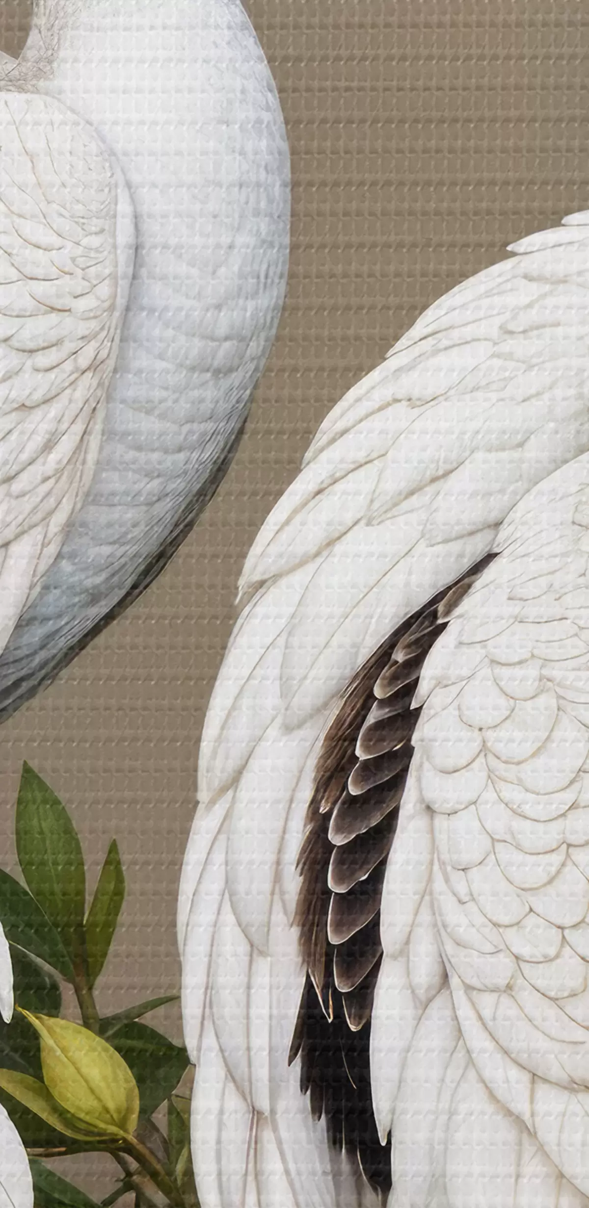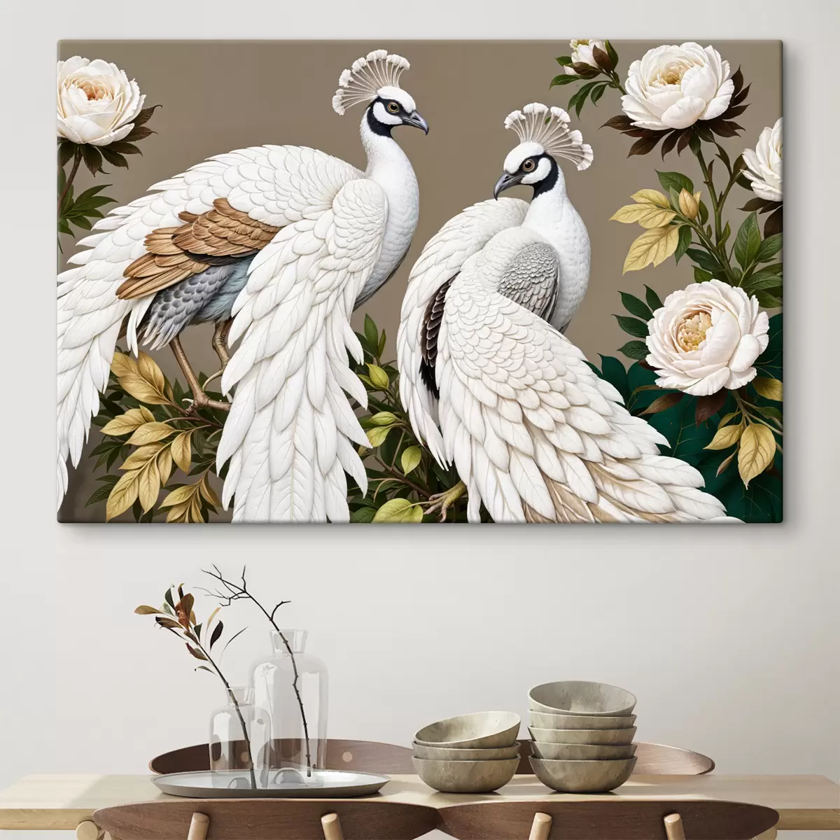 Картина Два білих павича з ошатним пір'ям сидять на гілці з квітами Арт. s40022