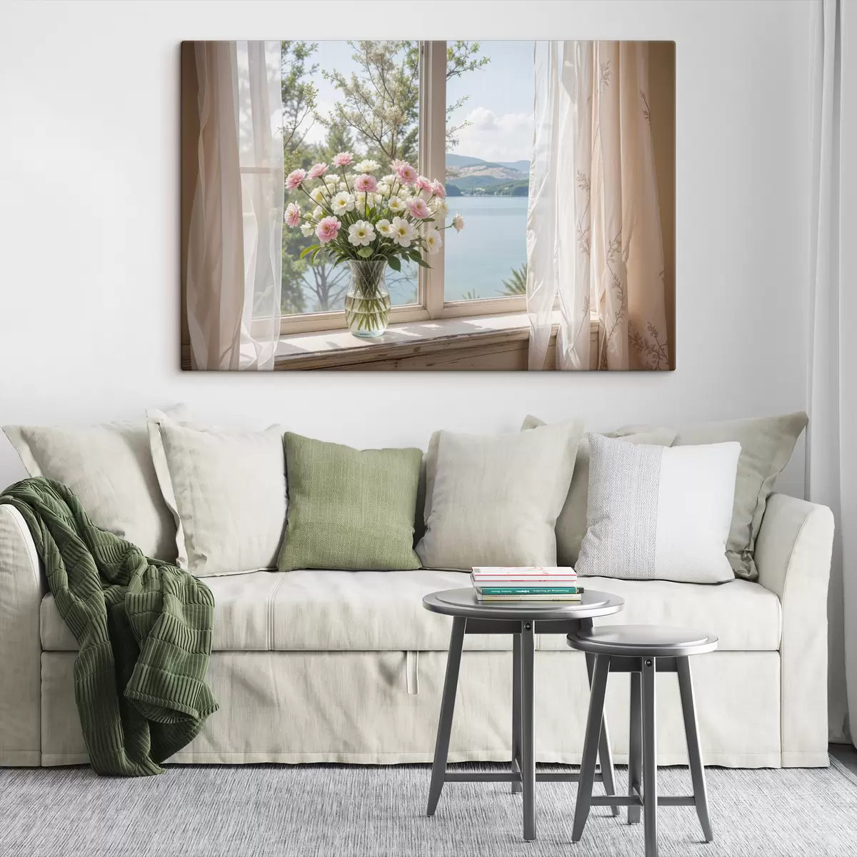 Картина Букет рожевих і білих квітів у скляній вазі на підвіконні з мальовничим озером і горами Арт. s40151