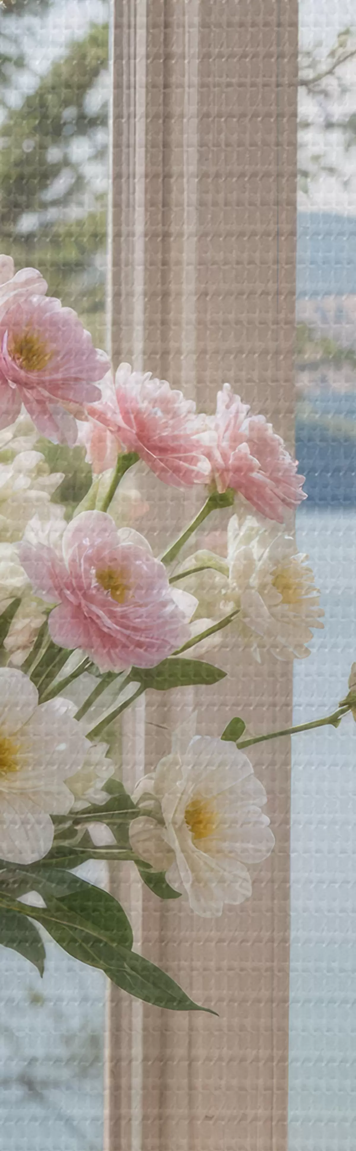 Картина Букет рожевих і білих квітів у скляній вазі на підвіконні з мальовничим озером і горами  s40151