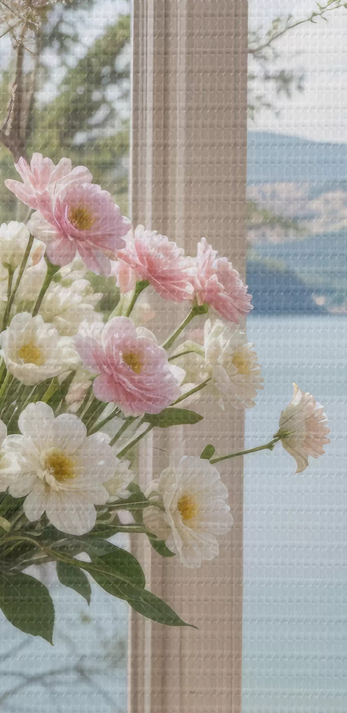 Картина Букет рожевих і білих квітів у скляній вазі на підвіконні з мальовничим озером і горами  s40151