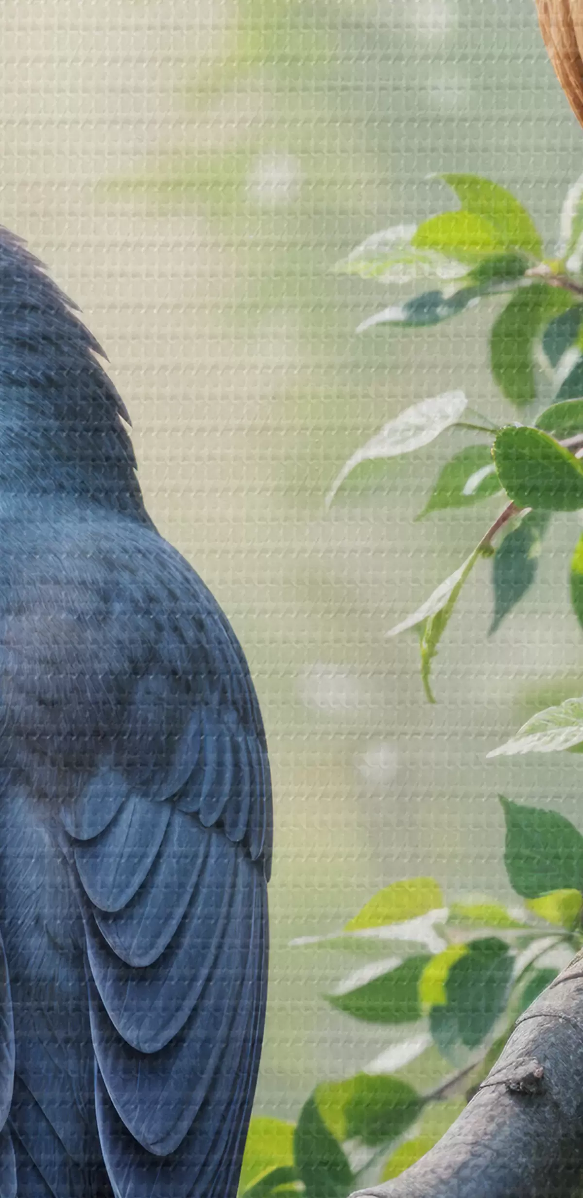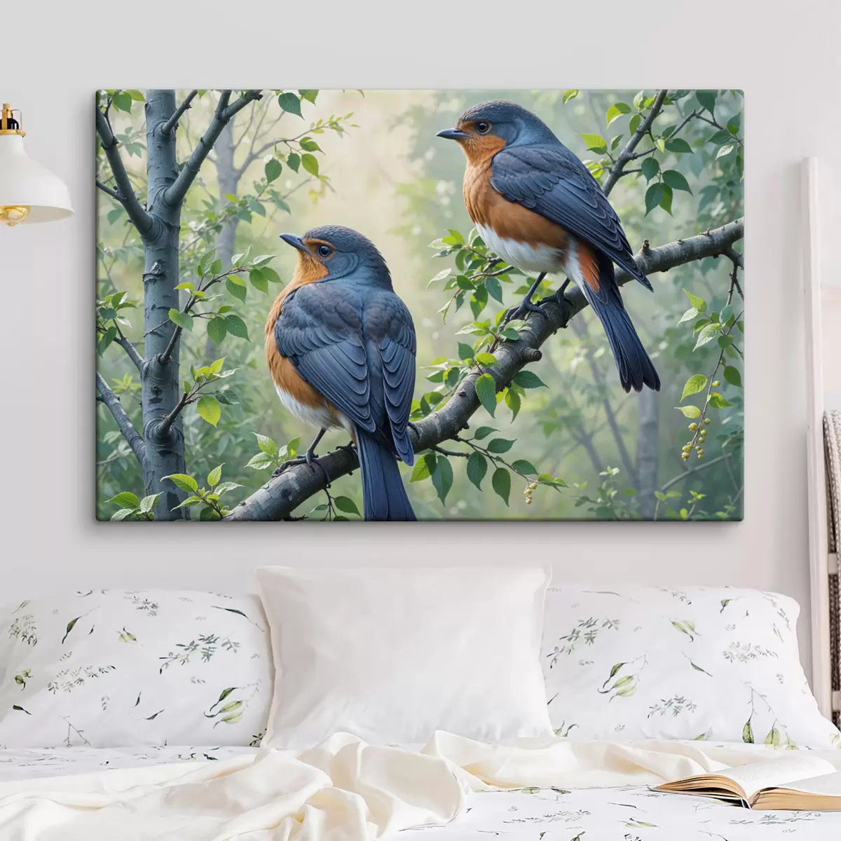 Картина Два синьо-помаранчеві птахи сиділи на гілці дерева із зеленим листям на задньому плані Арт. s40156