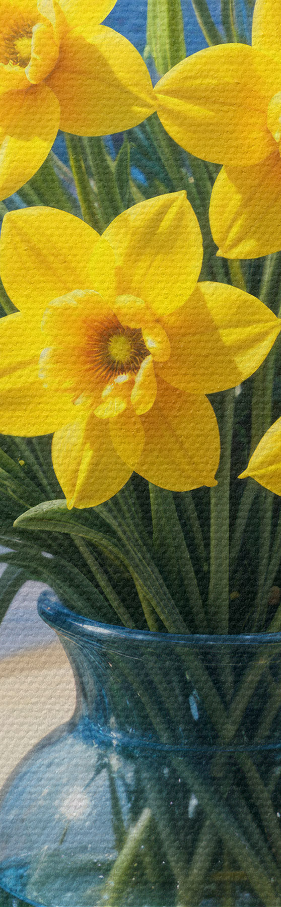 Картина Букет жовтих нарцисів і білих ромашок у скляній вазі на підвіконні з видом на пляж і океан Арт. s40171