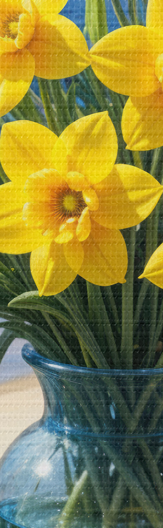 Картина Букет жовтих нарцисів і білих ромашок у скляній вазі на підвіконні з видом на пляж і океан s40171