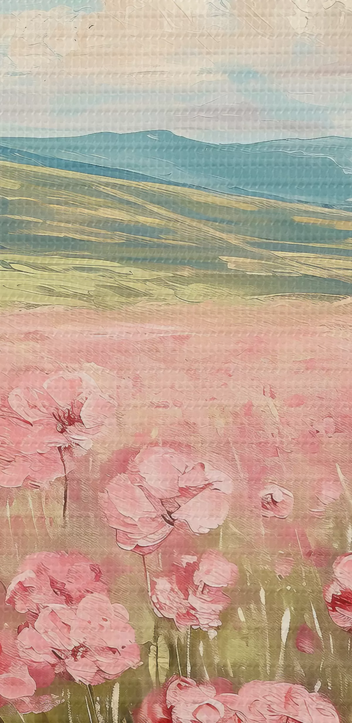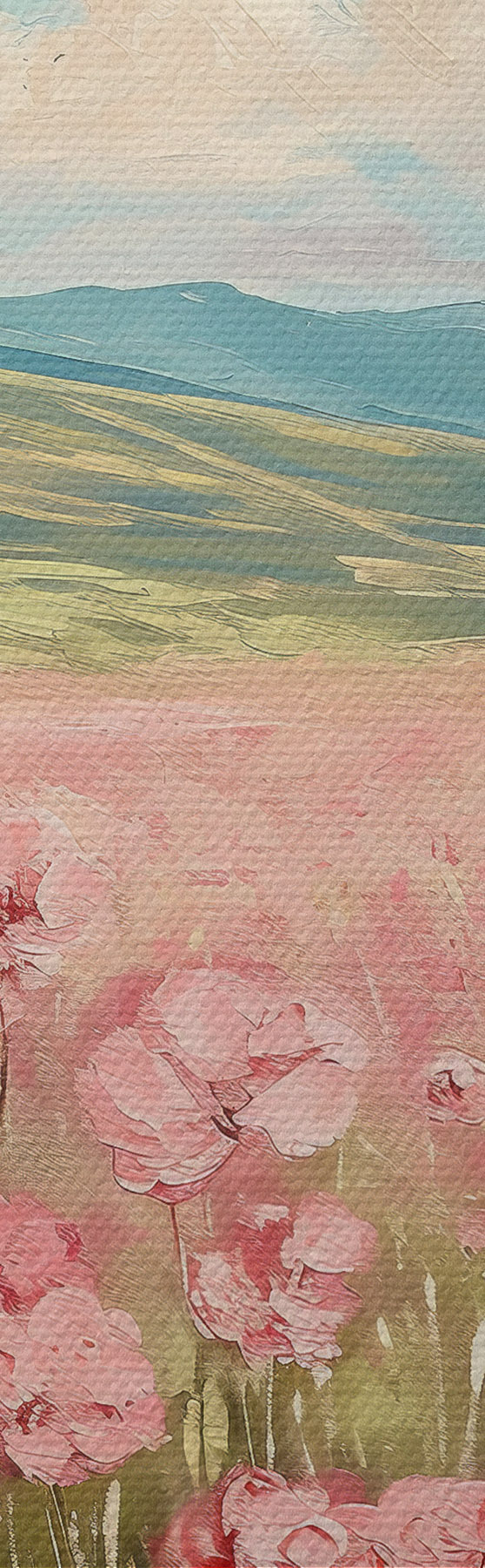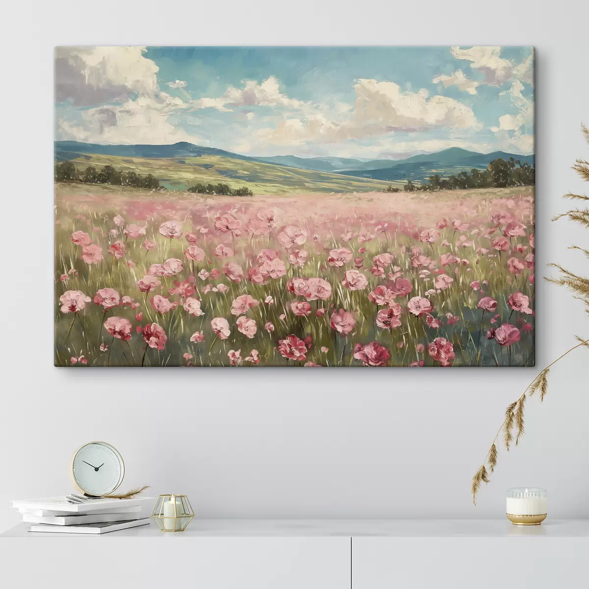 Картина Луг з рожевими квітами, гори, природний краєвид, блакитне небо з хмарами, акрил Арт. s40232