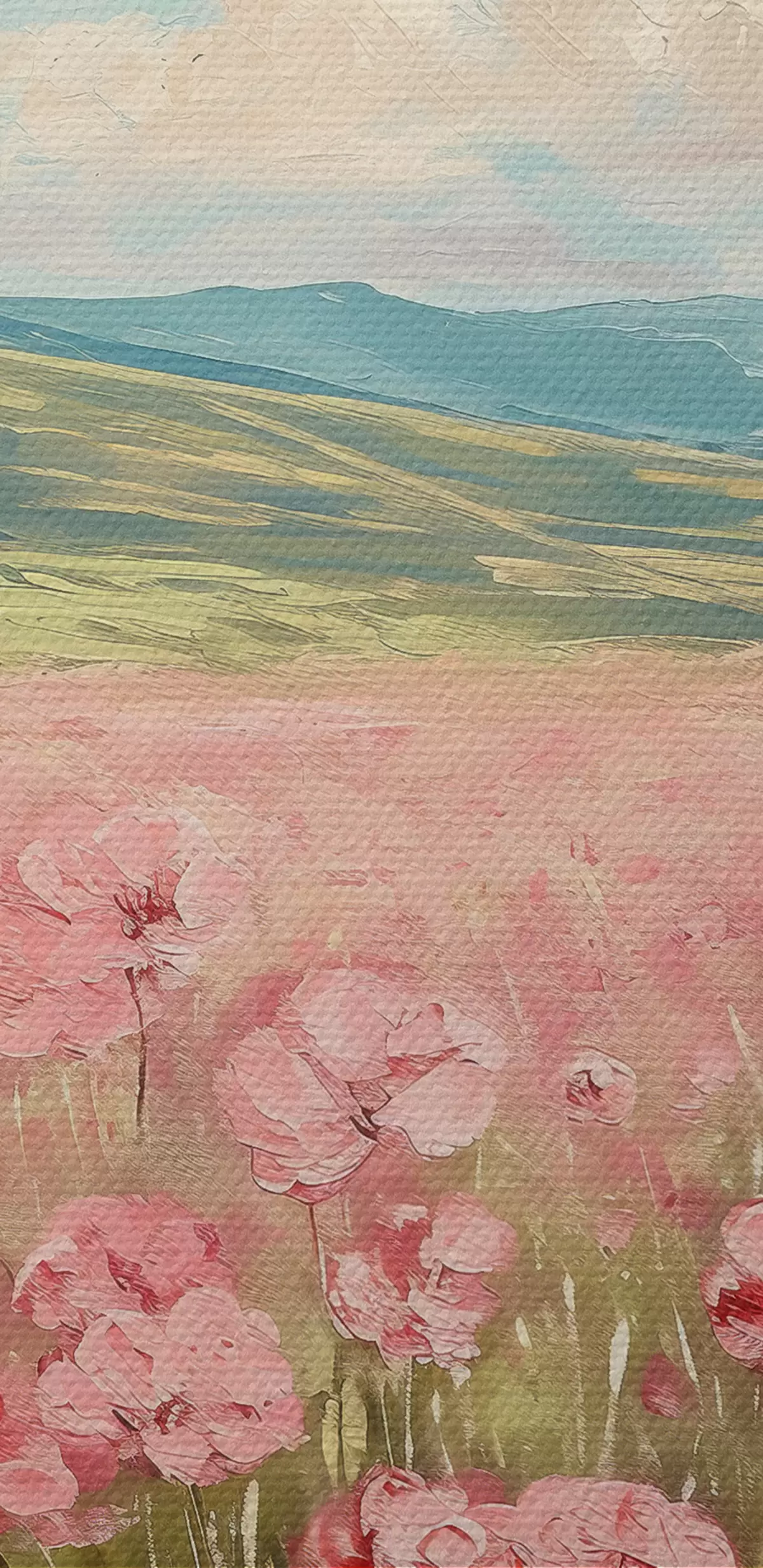 Картина Луг з рожевими квітами, гори, природний краєвид, блакитне небо з хмарами, акрил  s40232