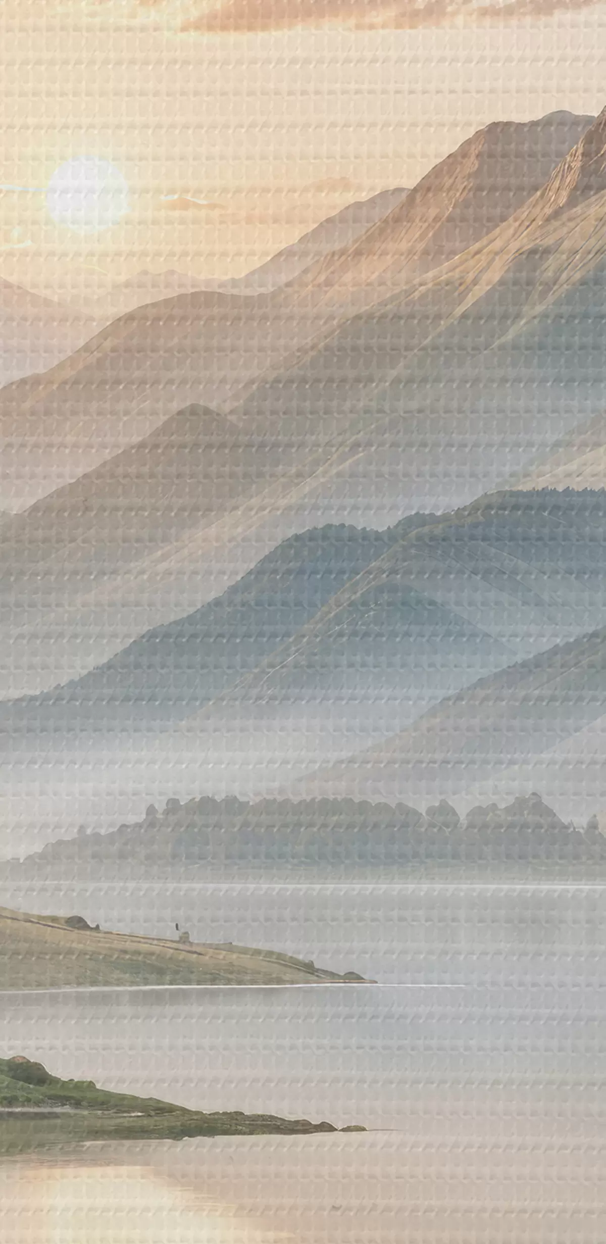 Картина Спокійний краєвид із озером, у якому відображаються гори, на задньому плані з маленьким човном на спокійній воді Арт. s40391
