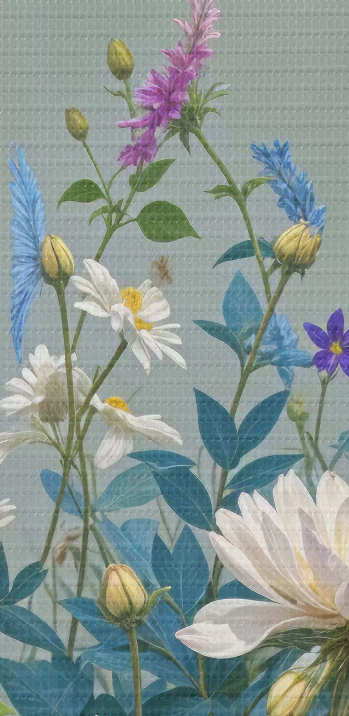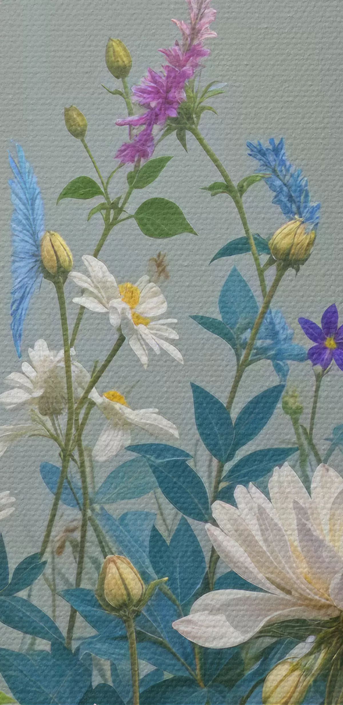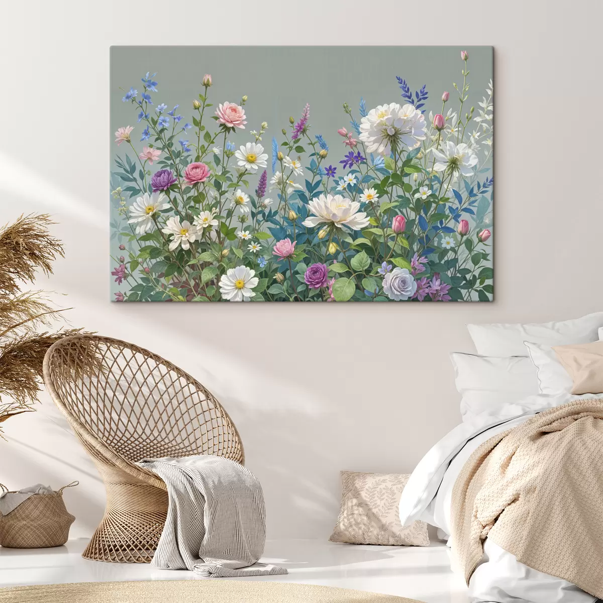 Картина Пишний, яскравий сад, наповнений різними барвистими квітами та квітучими рослинами на сірому фоні Арт. s40393