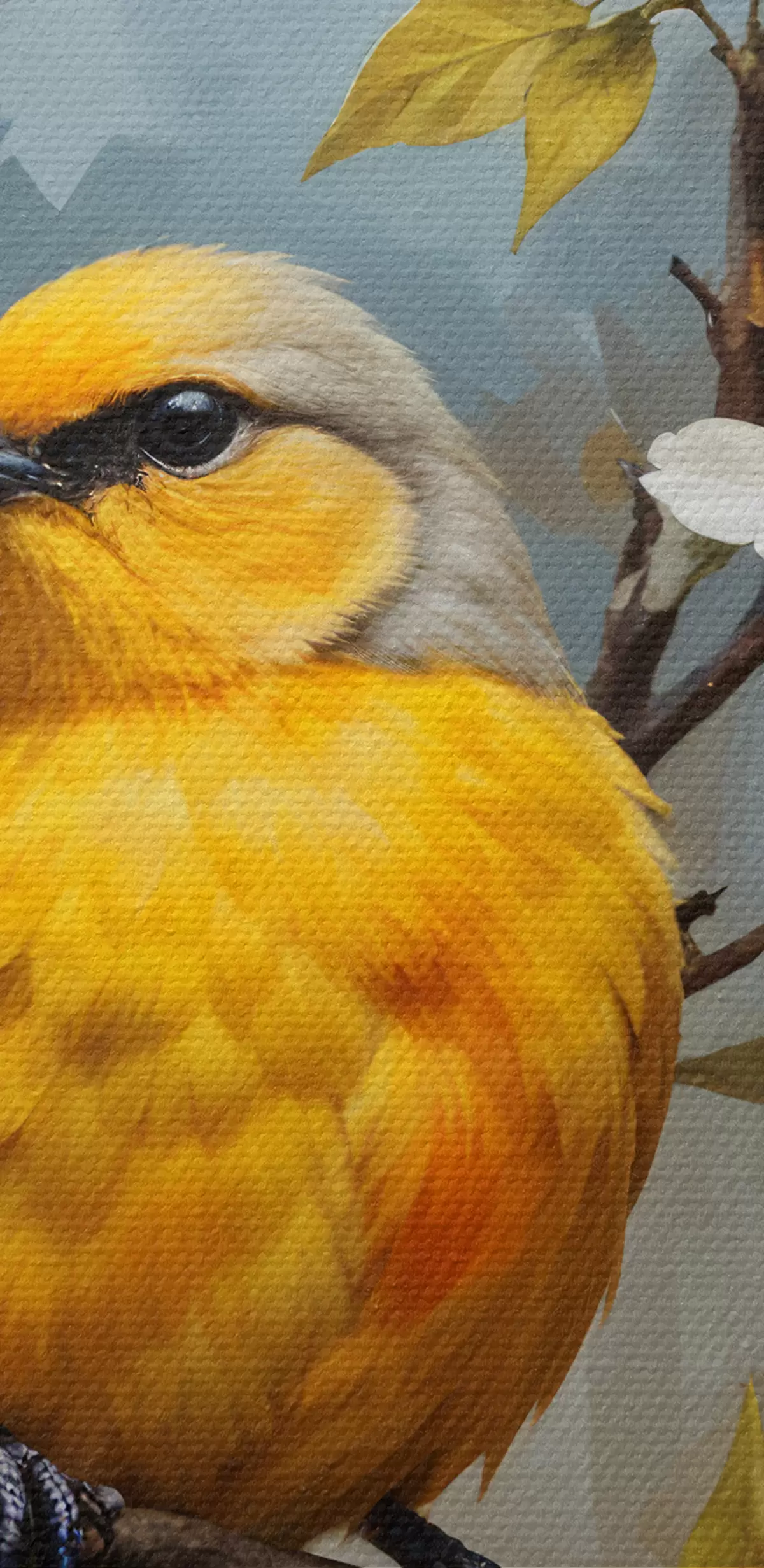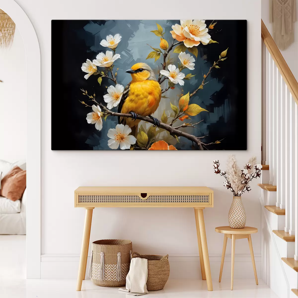 Картина Жовтий птах сидить на гілці з білими та оранжевими квітами на задньому плані Арт. s40550