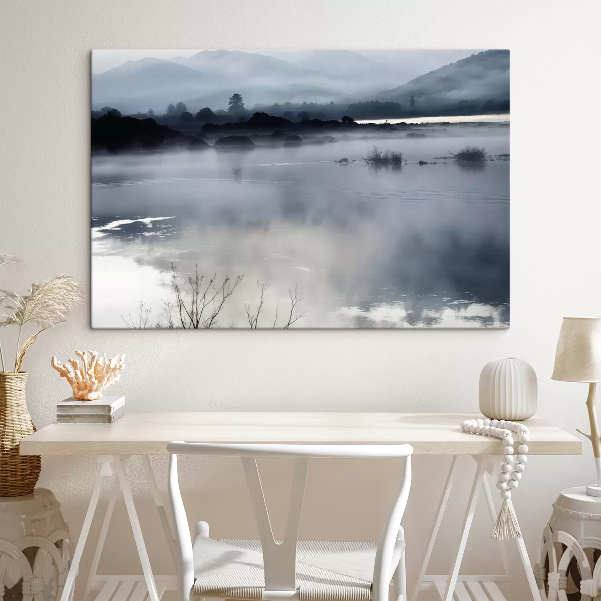 Картина Туманне озеро, оточене силуетами пагорбів і дерев на задньому плані, зі спокійною світловідбиваючою поверхнею Арт. s40552