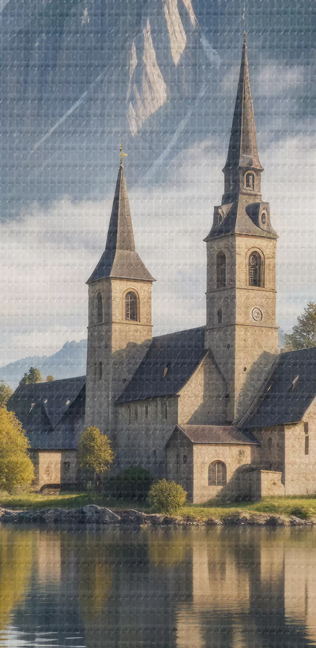 Картина Мальовниче альпійське село, розташоване вздовж тихого озера, з високими засніженими горами Арт. s40554