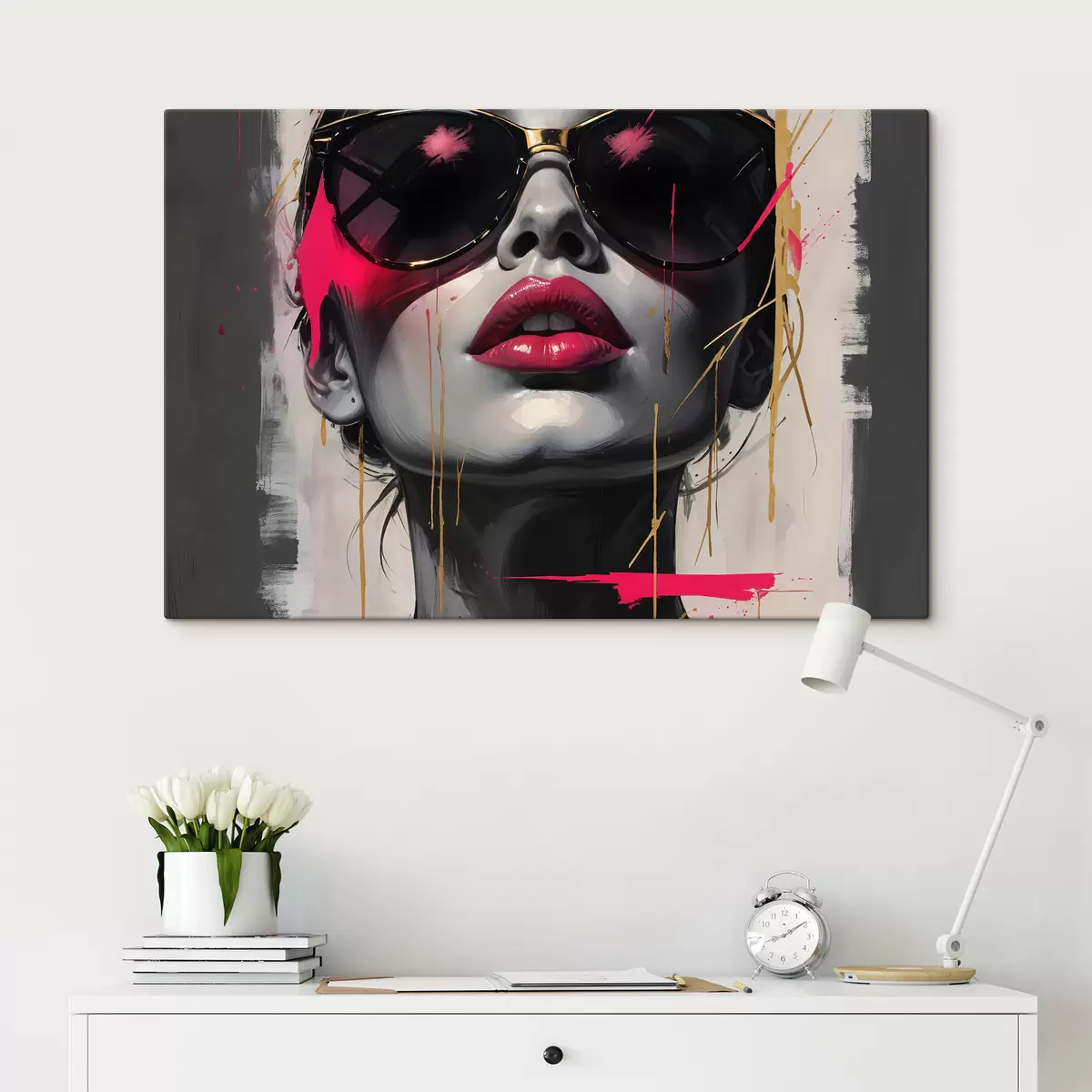 Картина Абстрактний портрет молодої жінки в сонцезахисних окулярах з рожевими губами та абстрактними формами та бризками рожевого кольору  s40558
