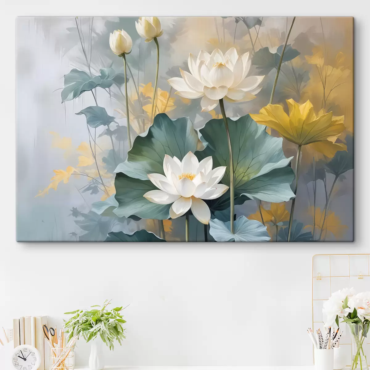 Картина Квіти білого лотоса в ставку з зеленими ліліями в оточенні жовтих квітів і розмитим фоном s40559