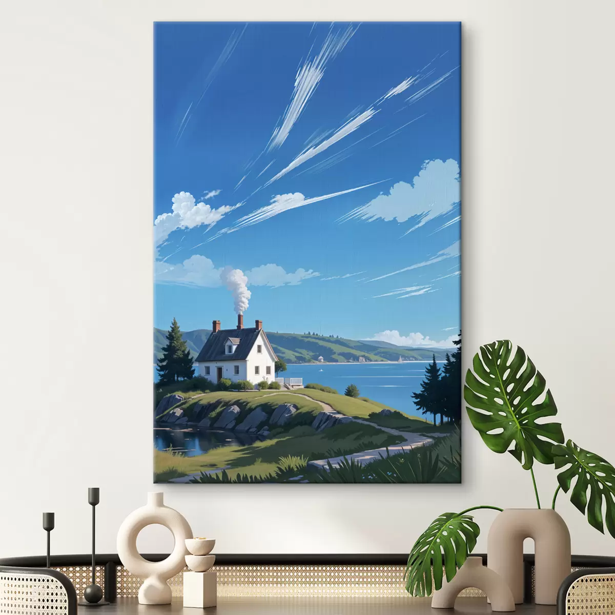 Картина Білий будинок на трав'янистому пагорбі з горами на задньому плані і блакитним небом з купчастими хмарами Арт. s40587