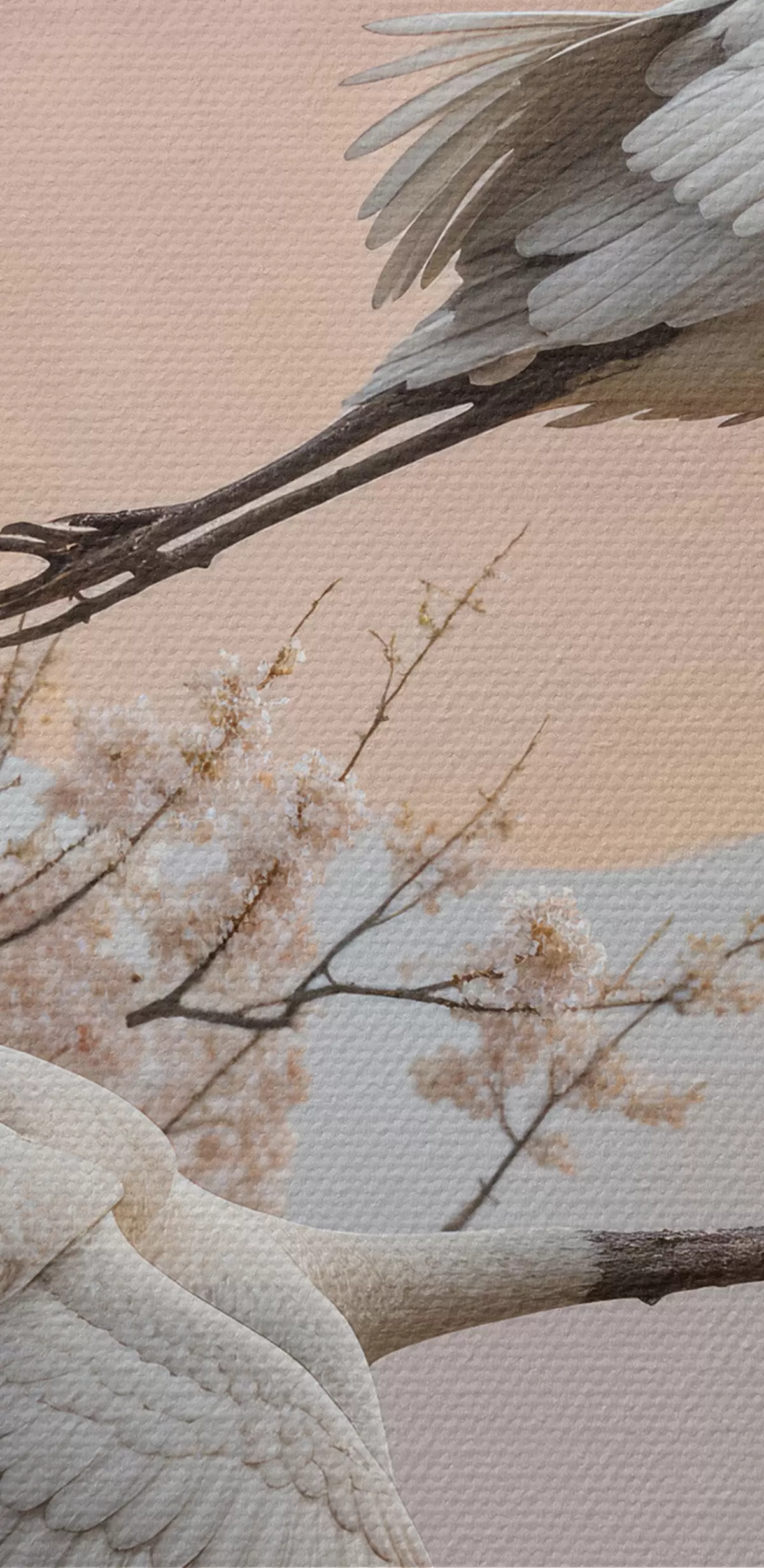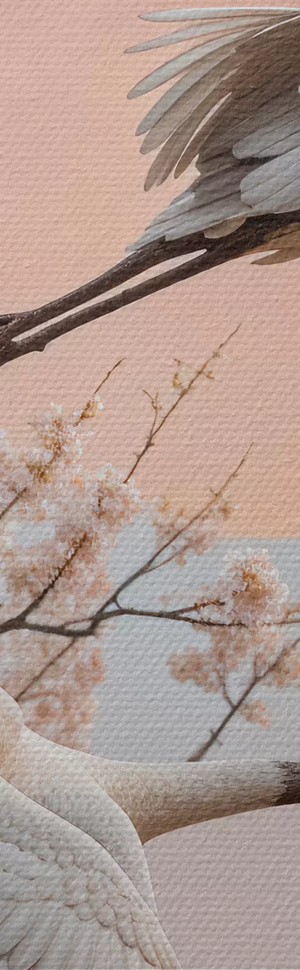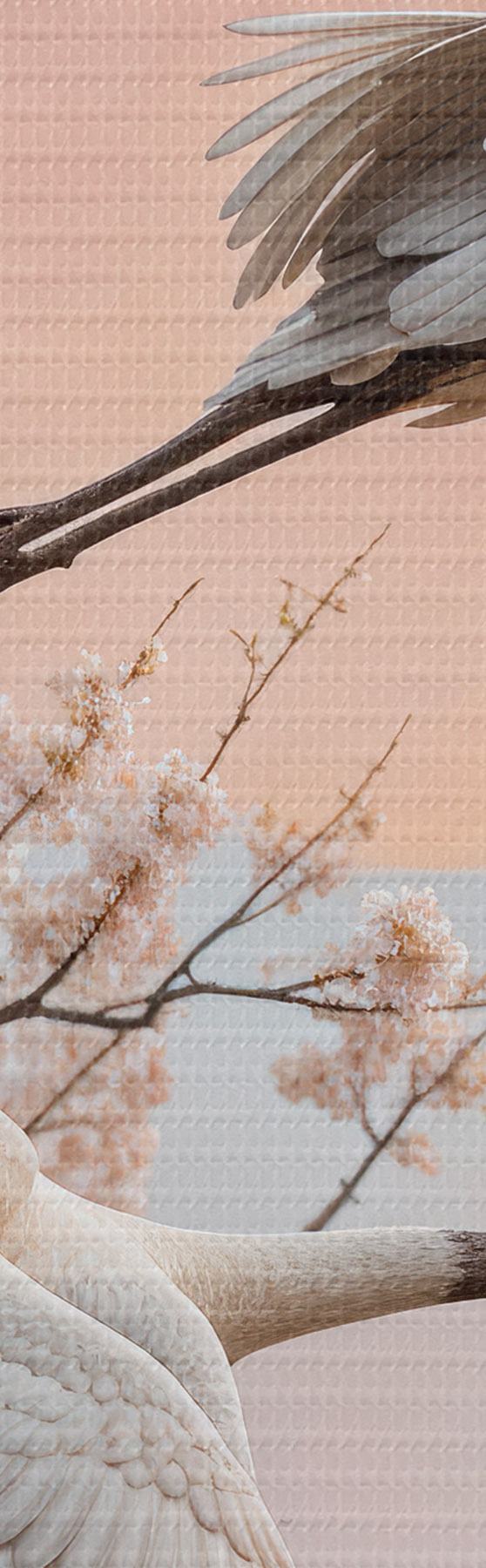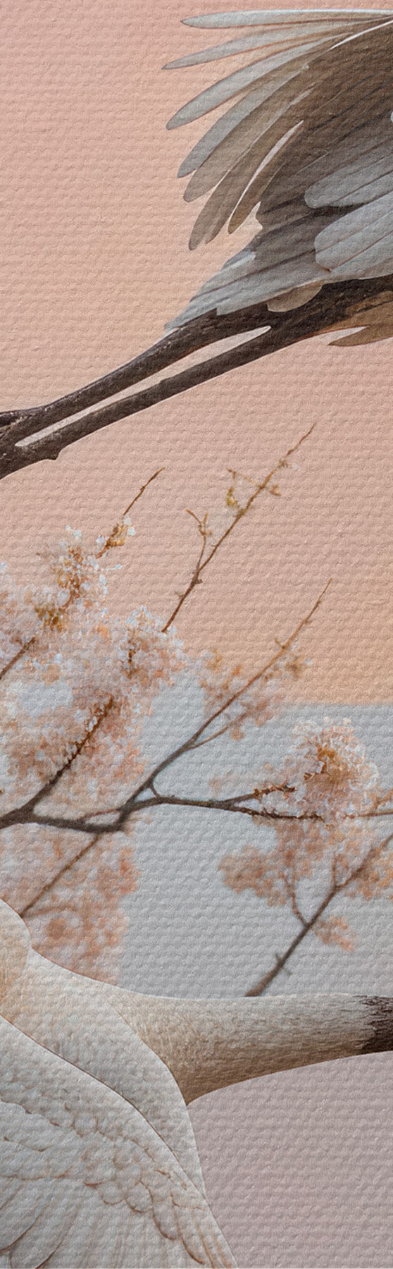Картина Два білі журавлі, що летять серед квітучих вишень на тлі рожевого західного неба Арт. s40601