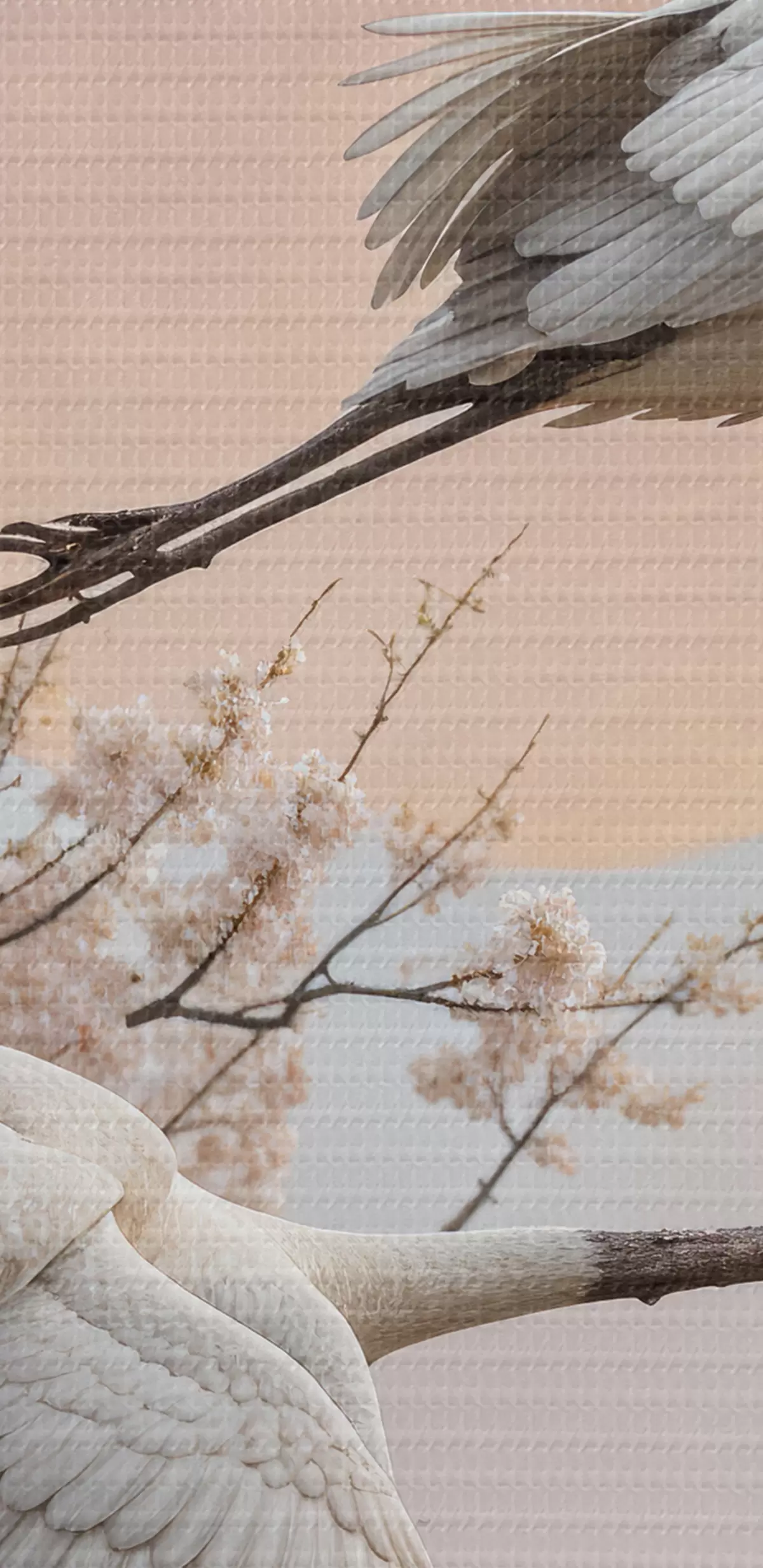 Картина Два білі журавлі, що летять серед квітучих вишень на тлі рожевого західного неба s40601