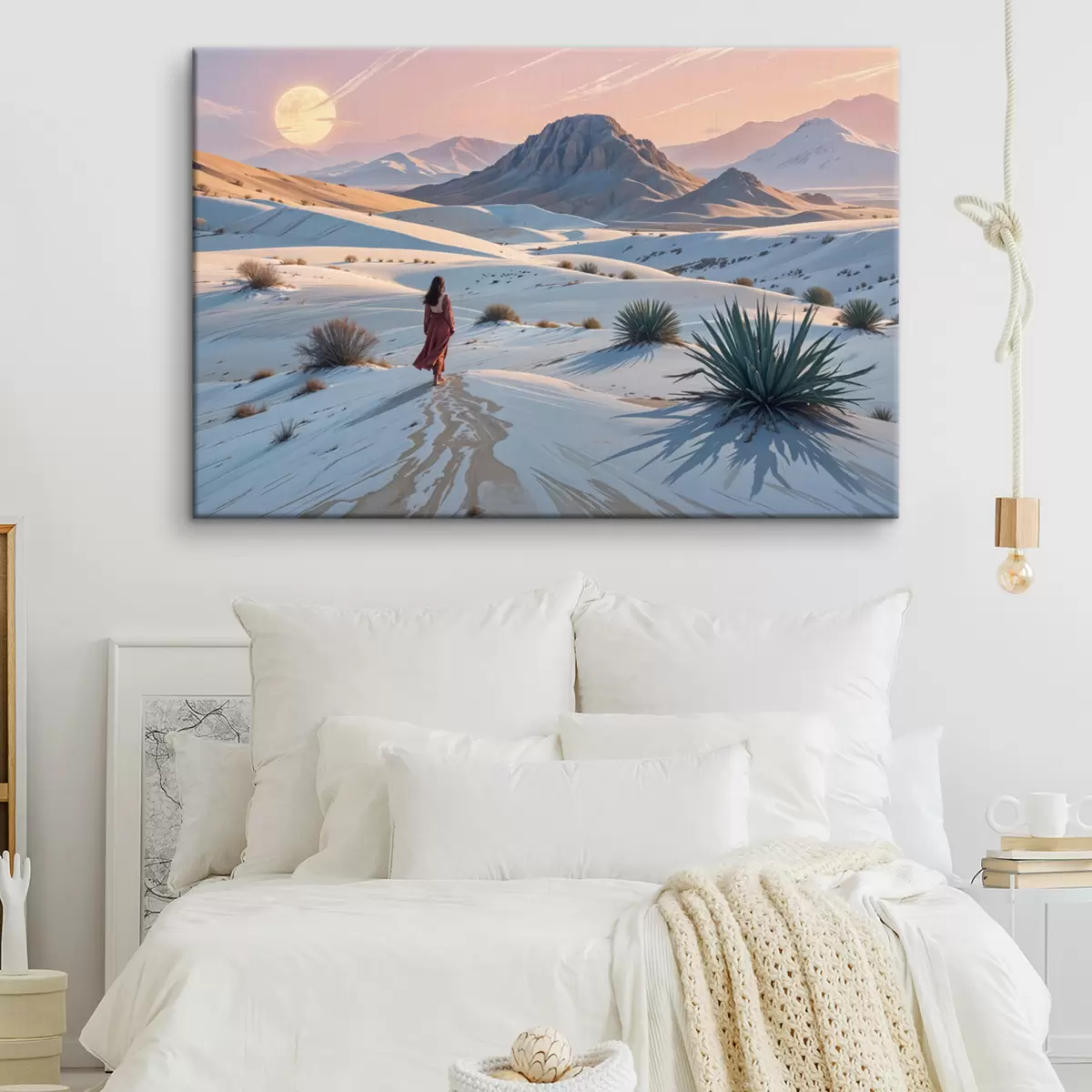Картина Жінка в червоній сукні на тлі пустельного пейзажу з горою на задньому плані та піщаними дюнами Арт. s40603