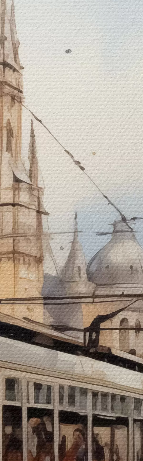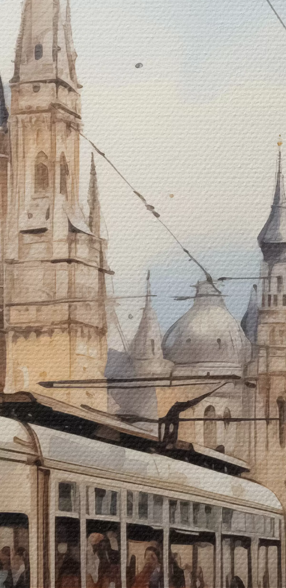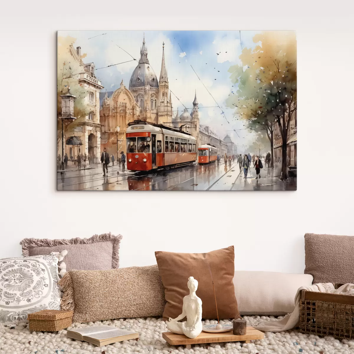 Картина Червоний трамвай на вулиці Відня акварель s40732