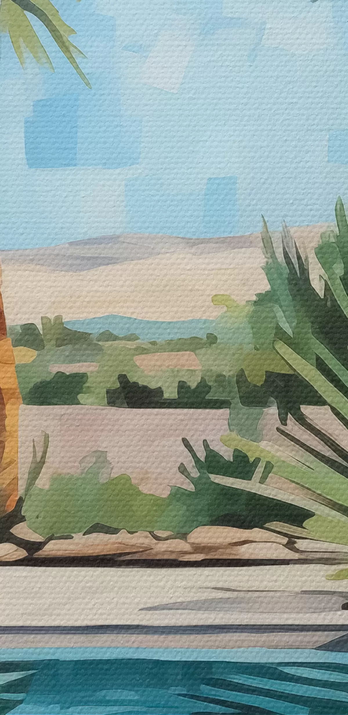 Картина Пальми біля готелю з басейном біля скель, синій, зелений, червоний колір Арт. s40748