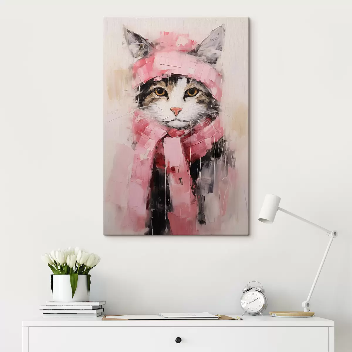 Картина Сірий чорний кіт у рожевій шапці та шарфі s40801