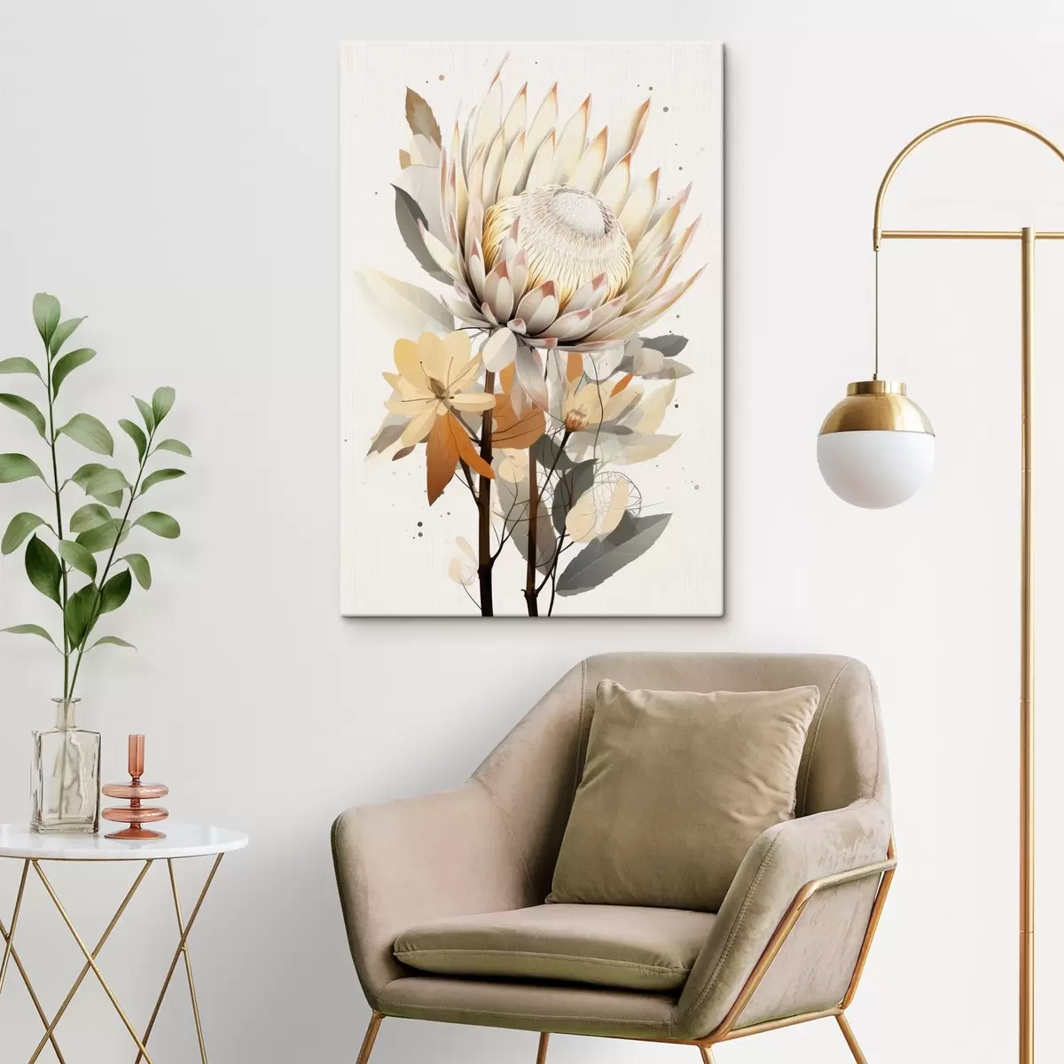 Картина Красиві квіти протеї з пишним листям, м'які бежеві кольори, бавовна Арт. s40817