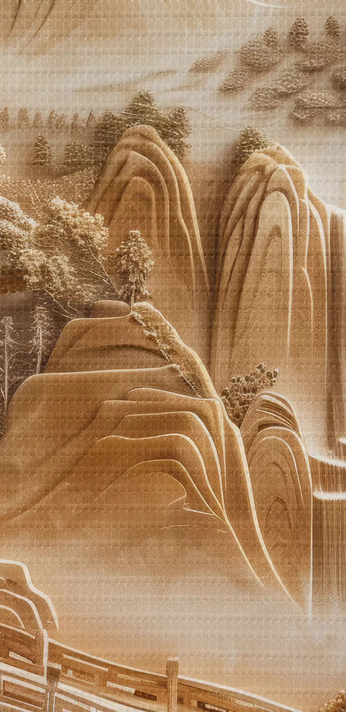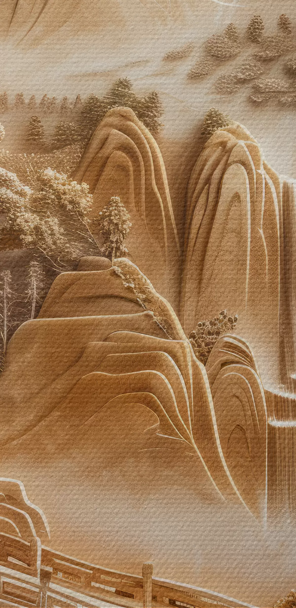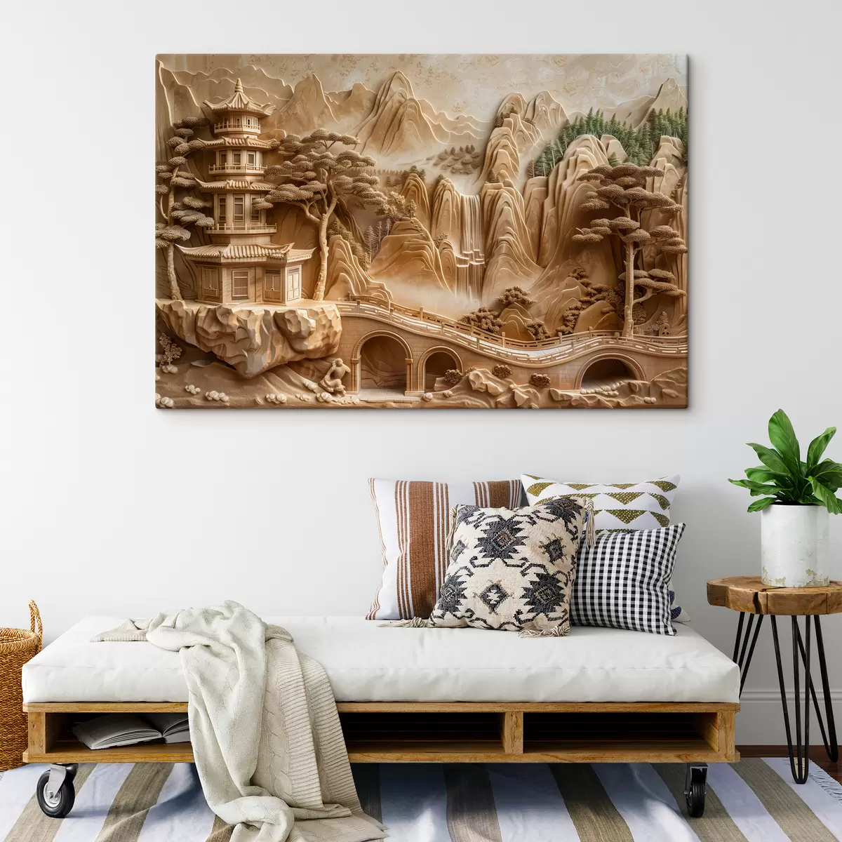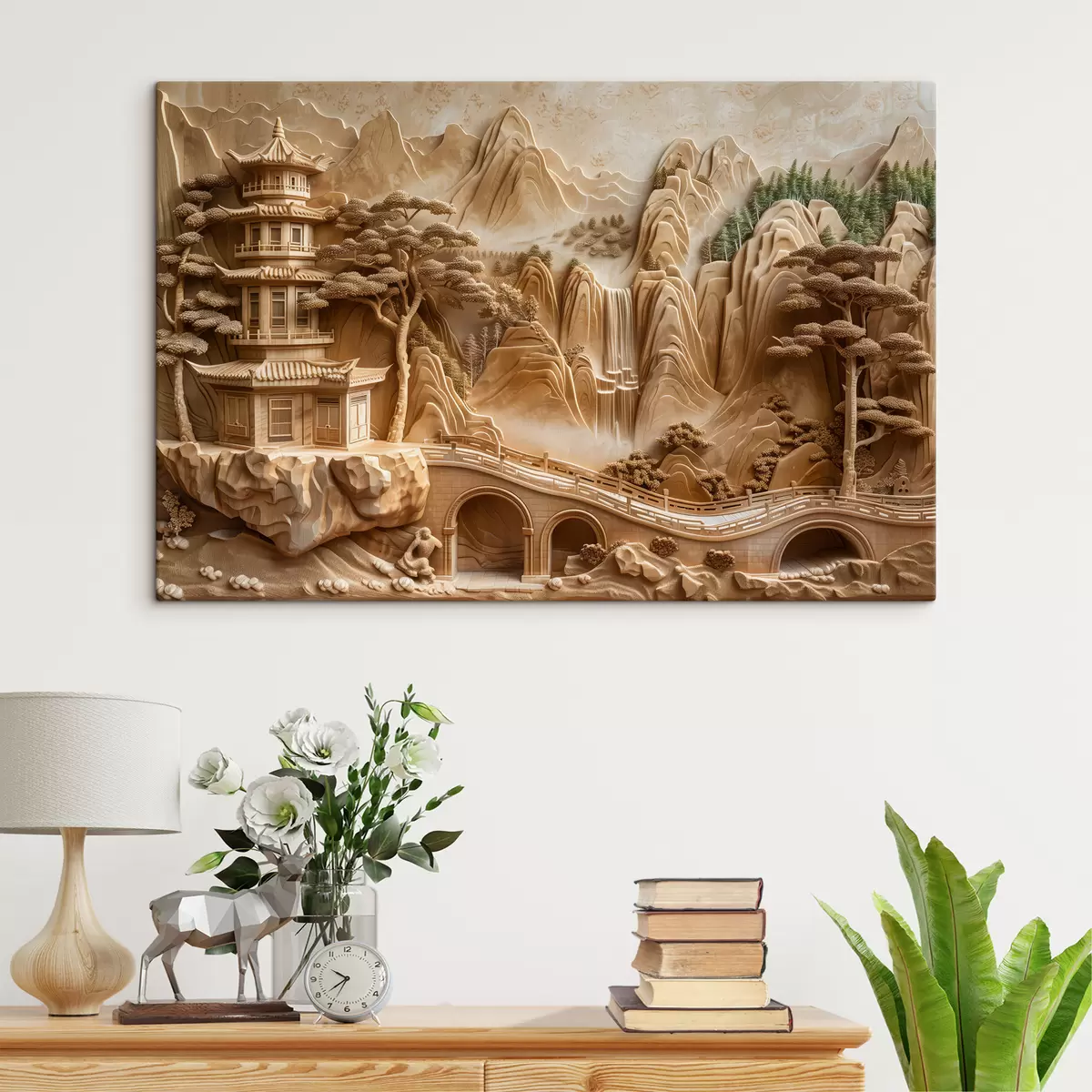 Картина Імітація барельєфу: гори з деревами, міст і храм, багатошаровий Арт. s40989