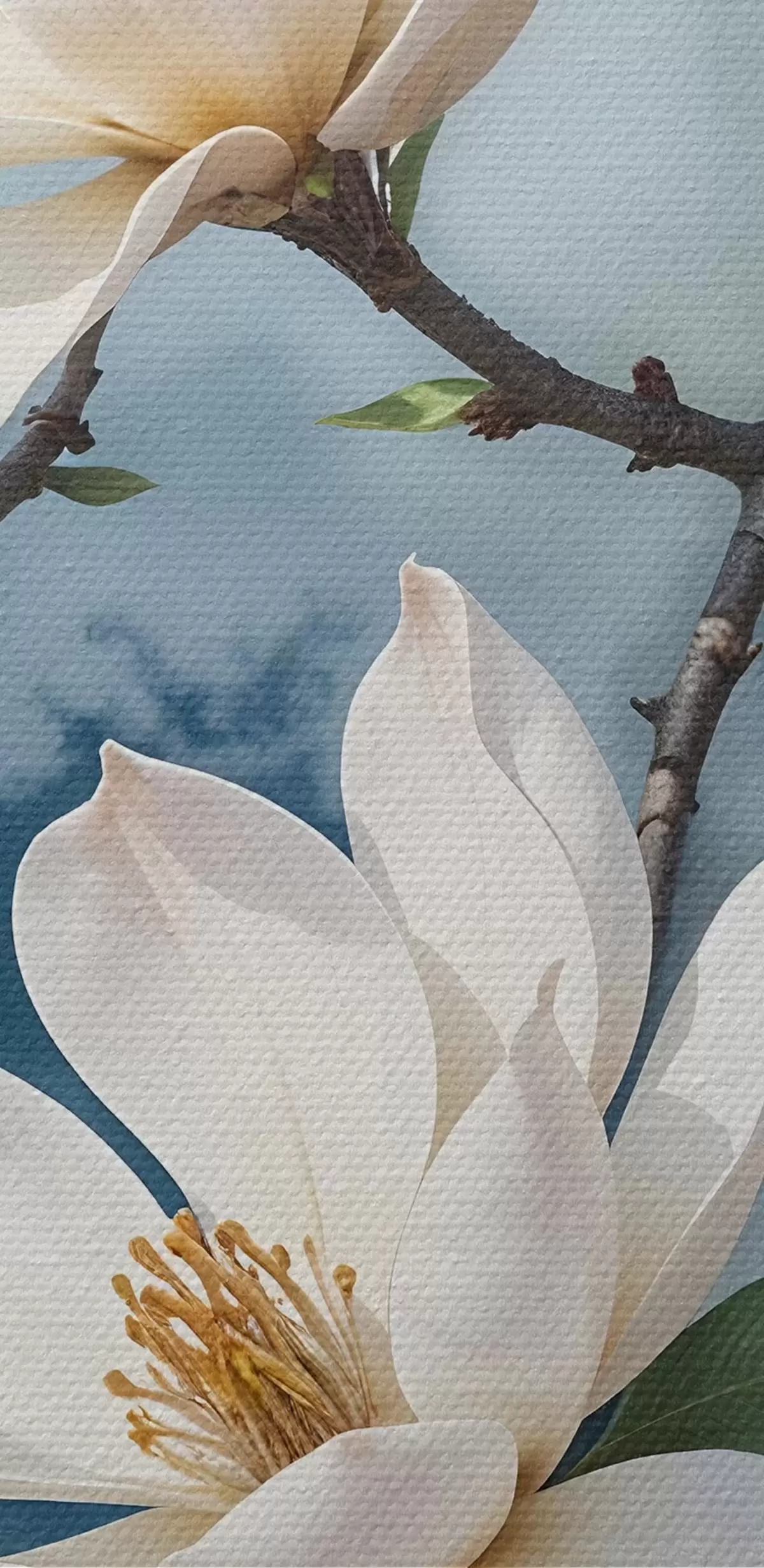 Картина Білі квіти магнолії, що розпускаються на гілках дерев на тлі м'якого акварельного блакитного неба s41081
