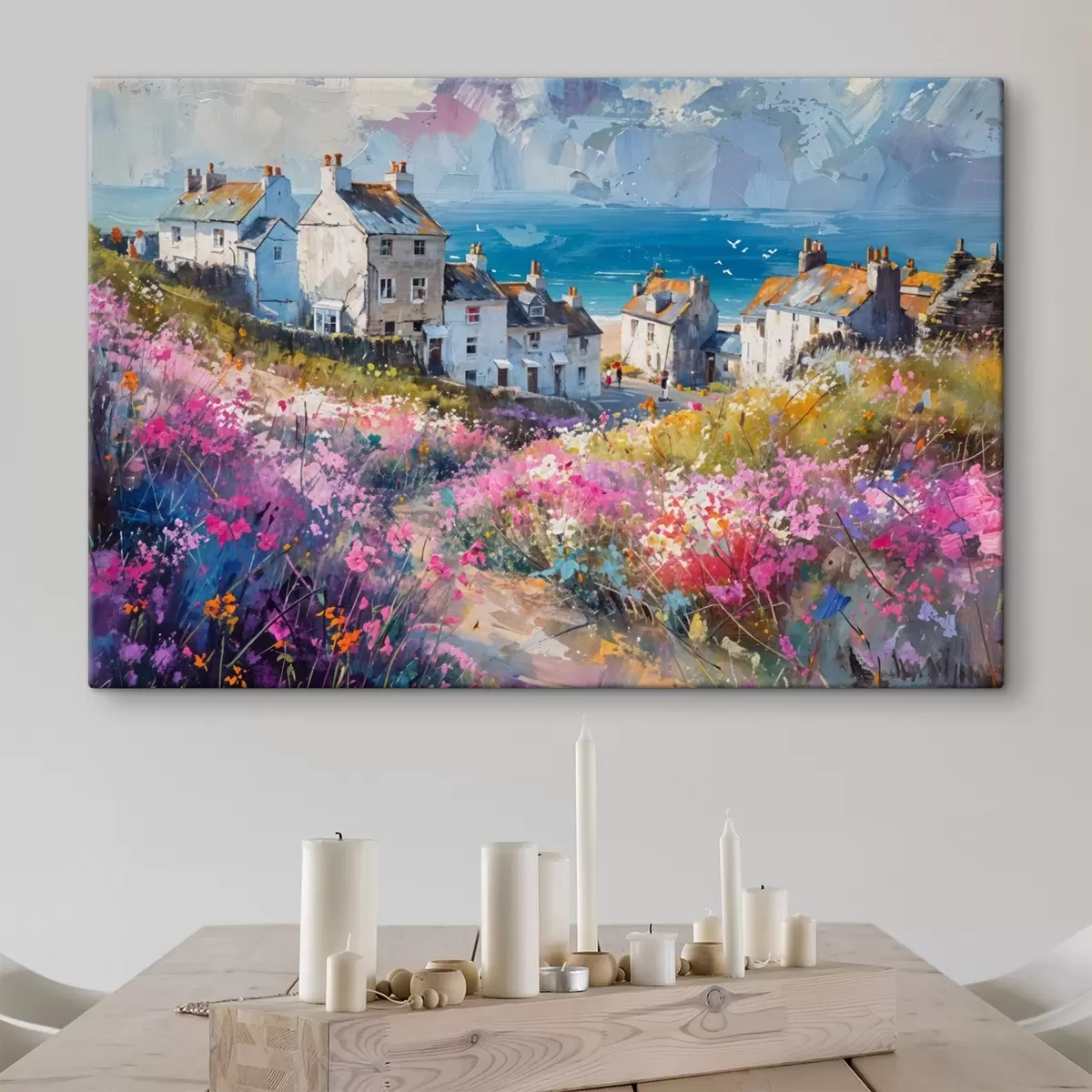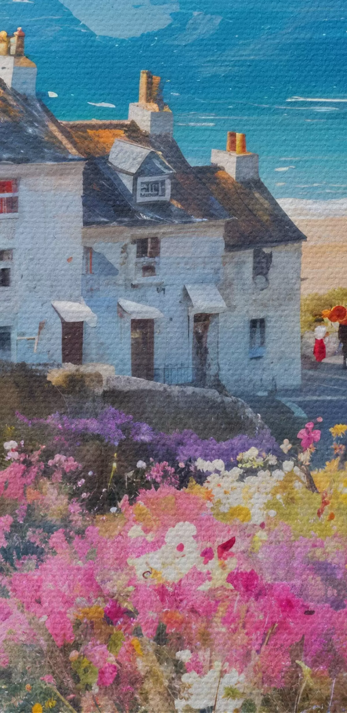 Картина Барвистий олійний живопис прибережного містечка з білими будинками та яскравим квітковим садом на передньому плані s41090