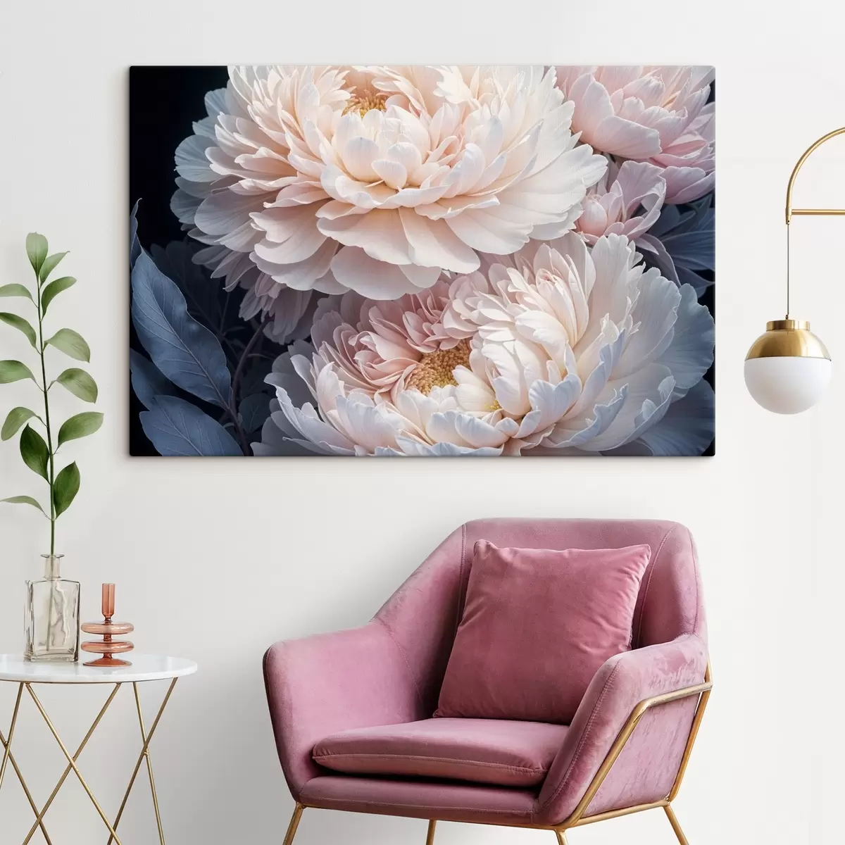 Картина Ніжні пастельно-рожеві півонії з м'якими, пухнастими пелюстками та синім листям на темному тлі s41092