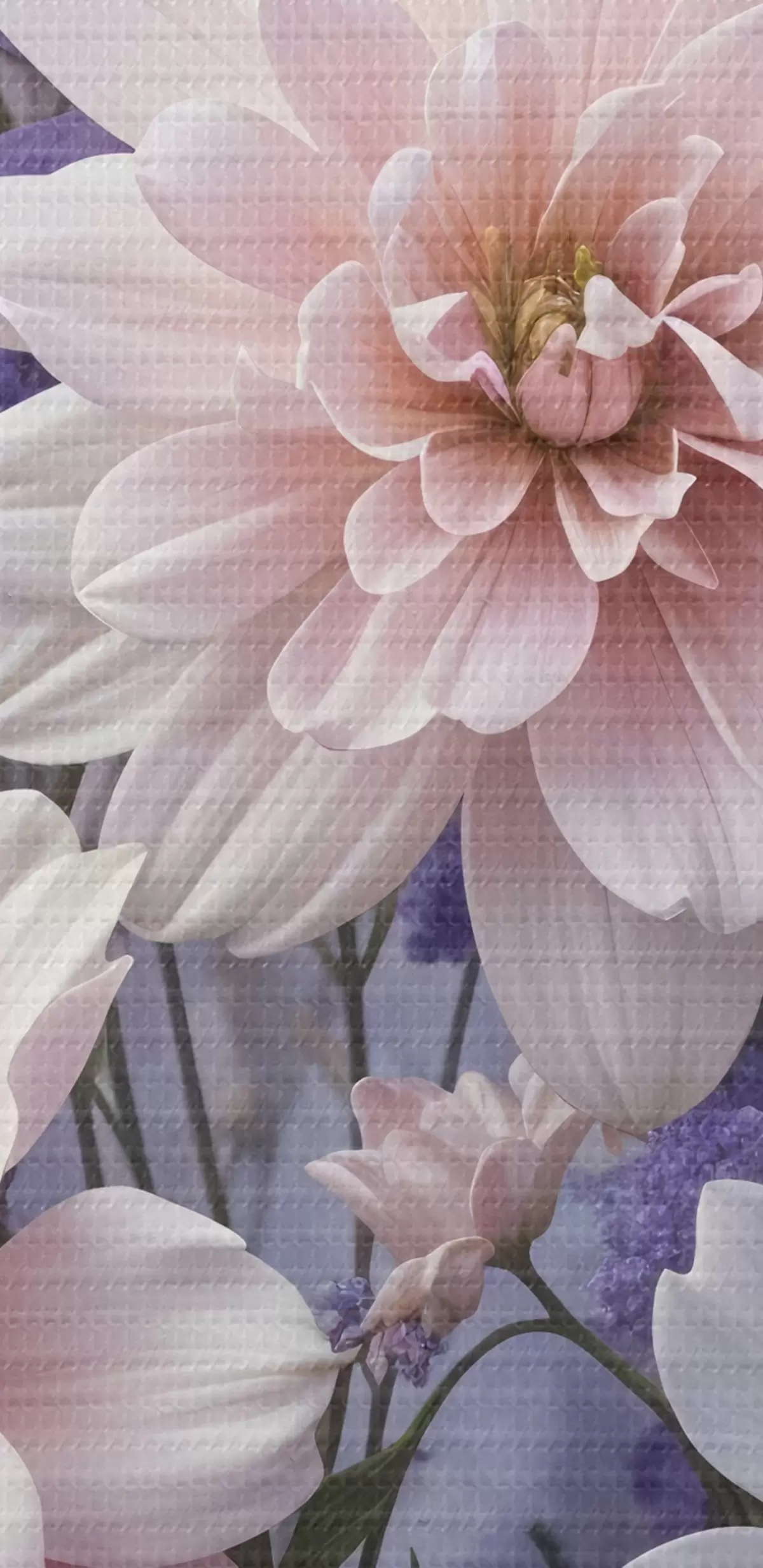 Картина Букет великих, яскравих квітів жоржин у відтінках рожевого, лавандового та білого на м'якому, розмитому тлі s41247
