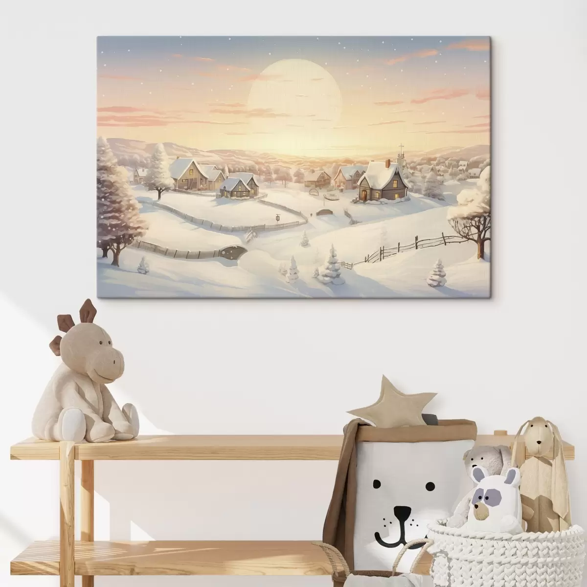 Картина Зимове село на заході сонця, будинки вкриті снігом, сосни Арт. s41380