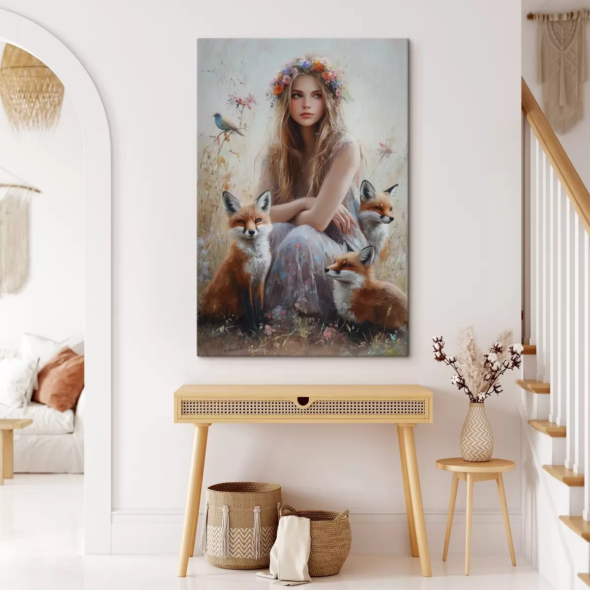 Картина Дівчина на лузі, дикі тварини, лисиці, птахи, квітковий вінок  s41451