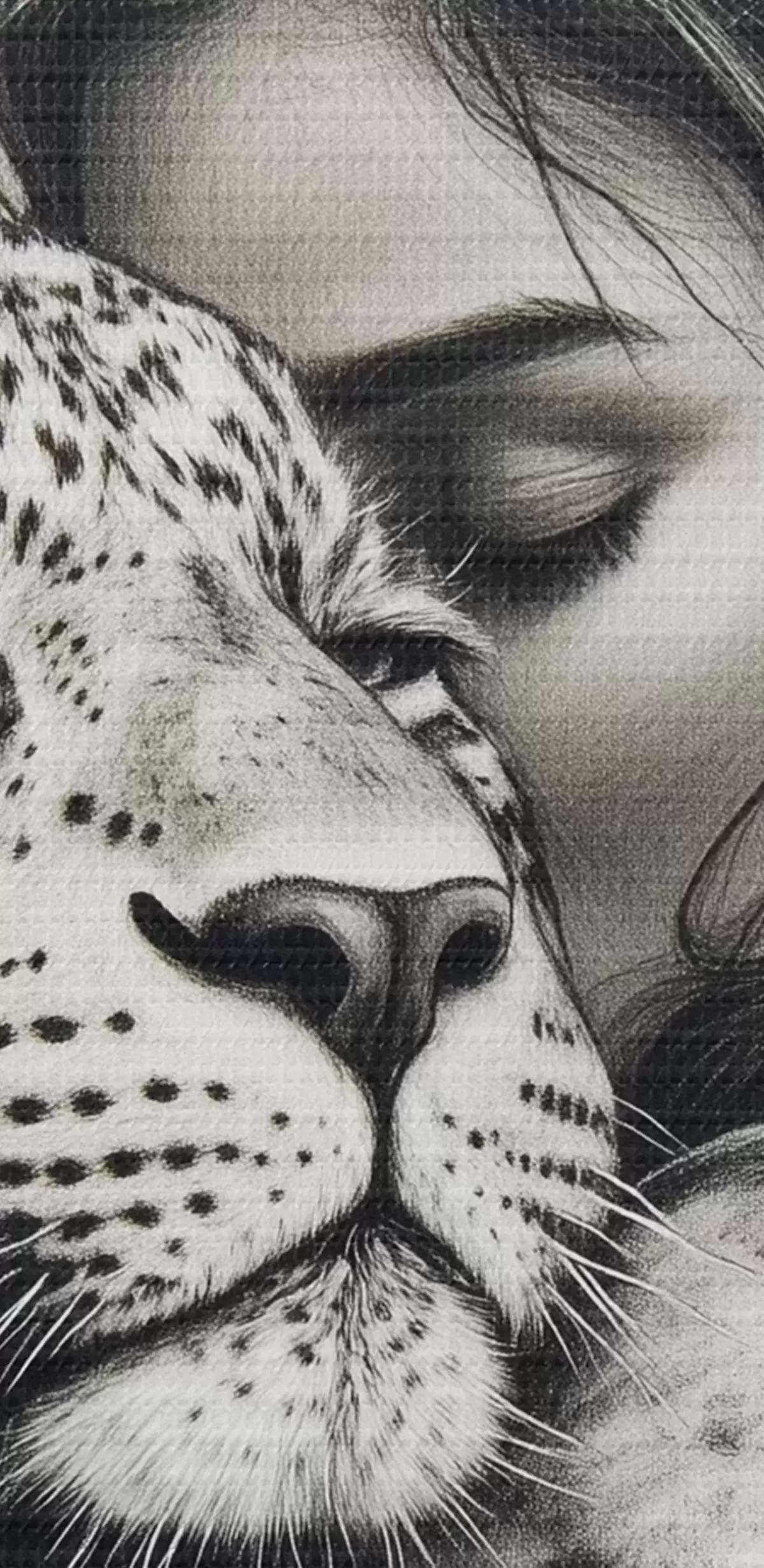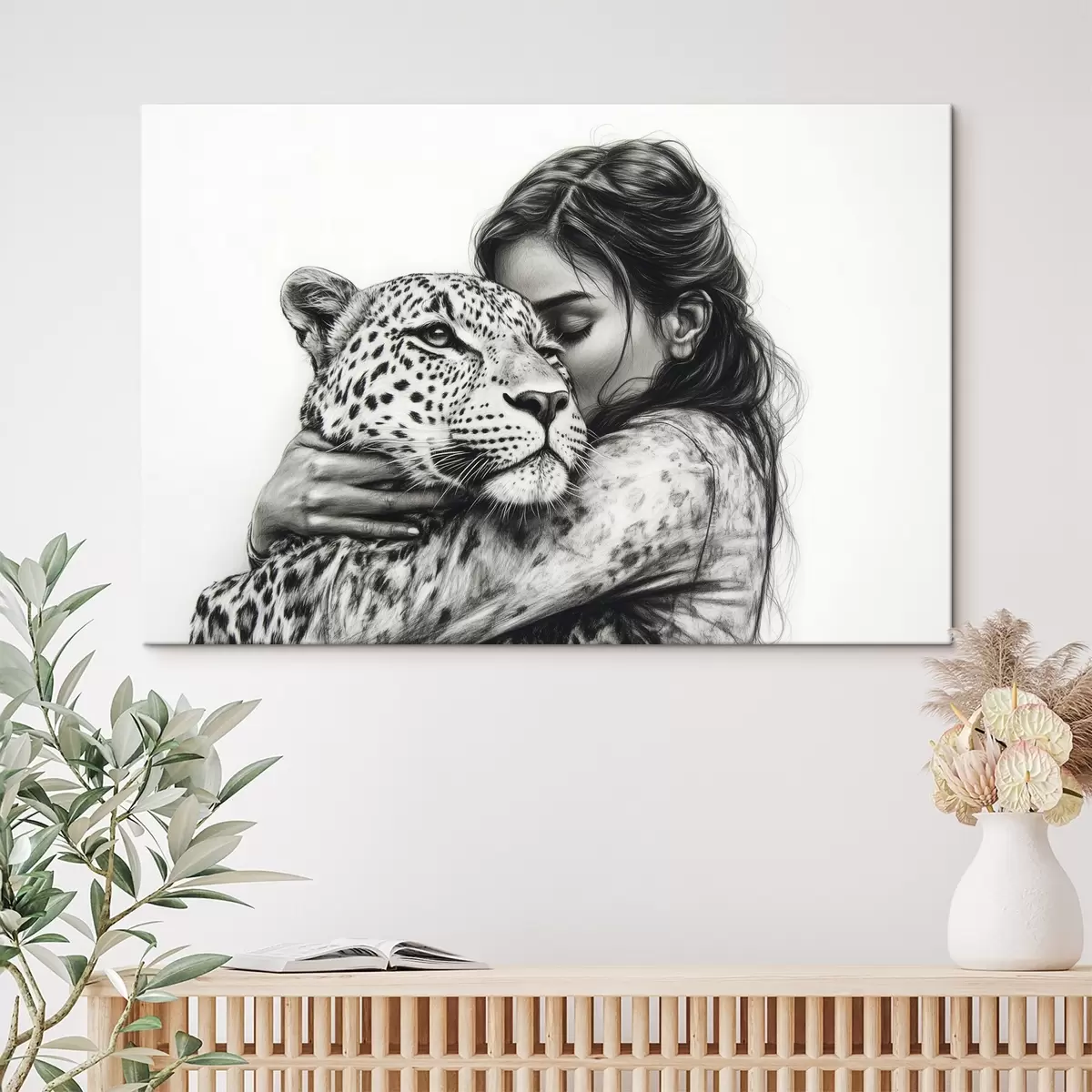 Картина Жінка з леопардом, дикі тварини, малюнок олівцем, чорно-білий s41455