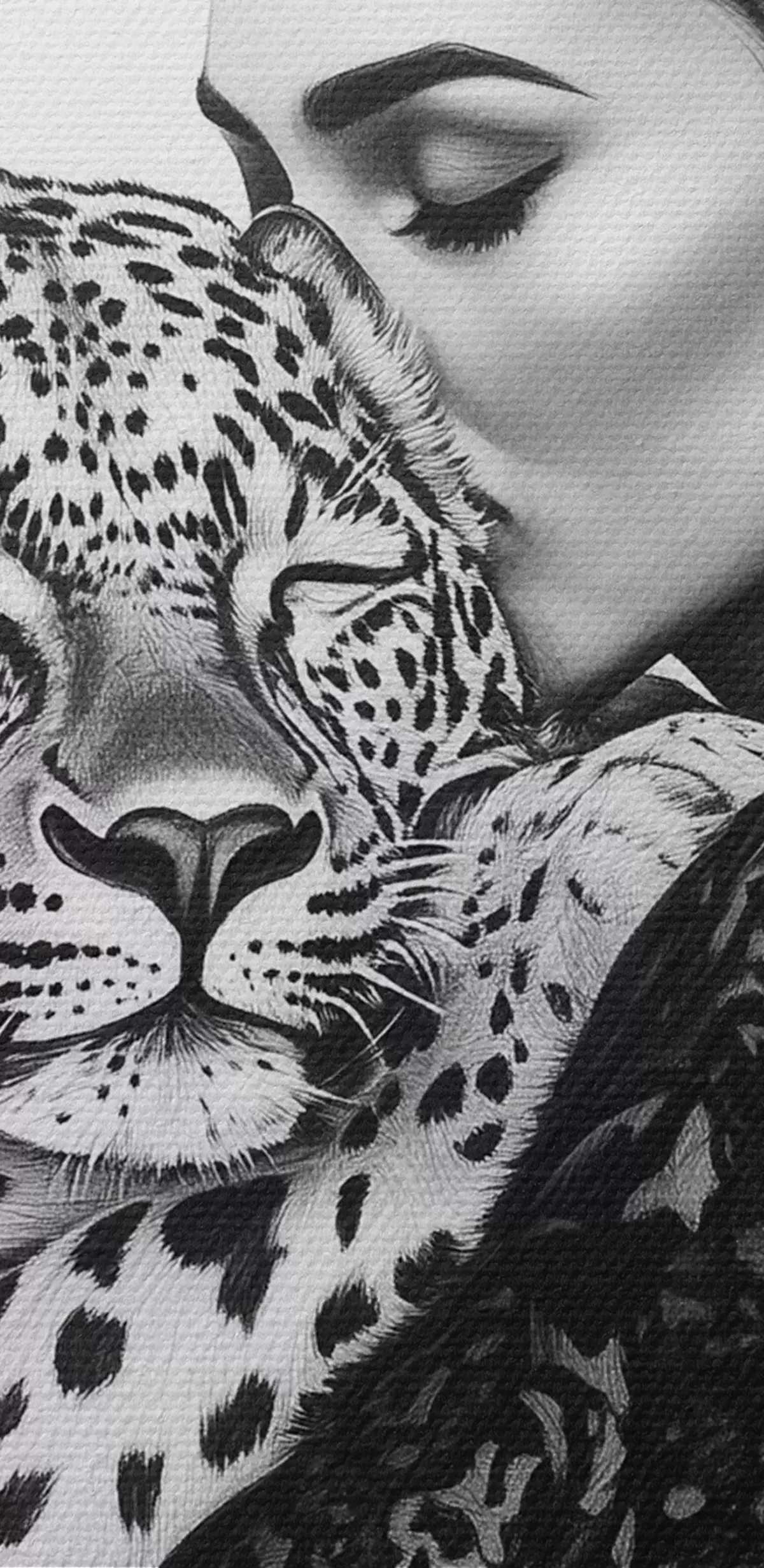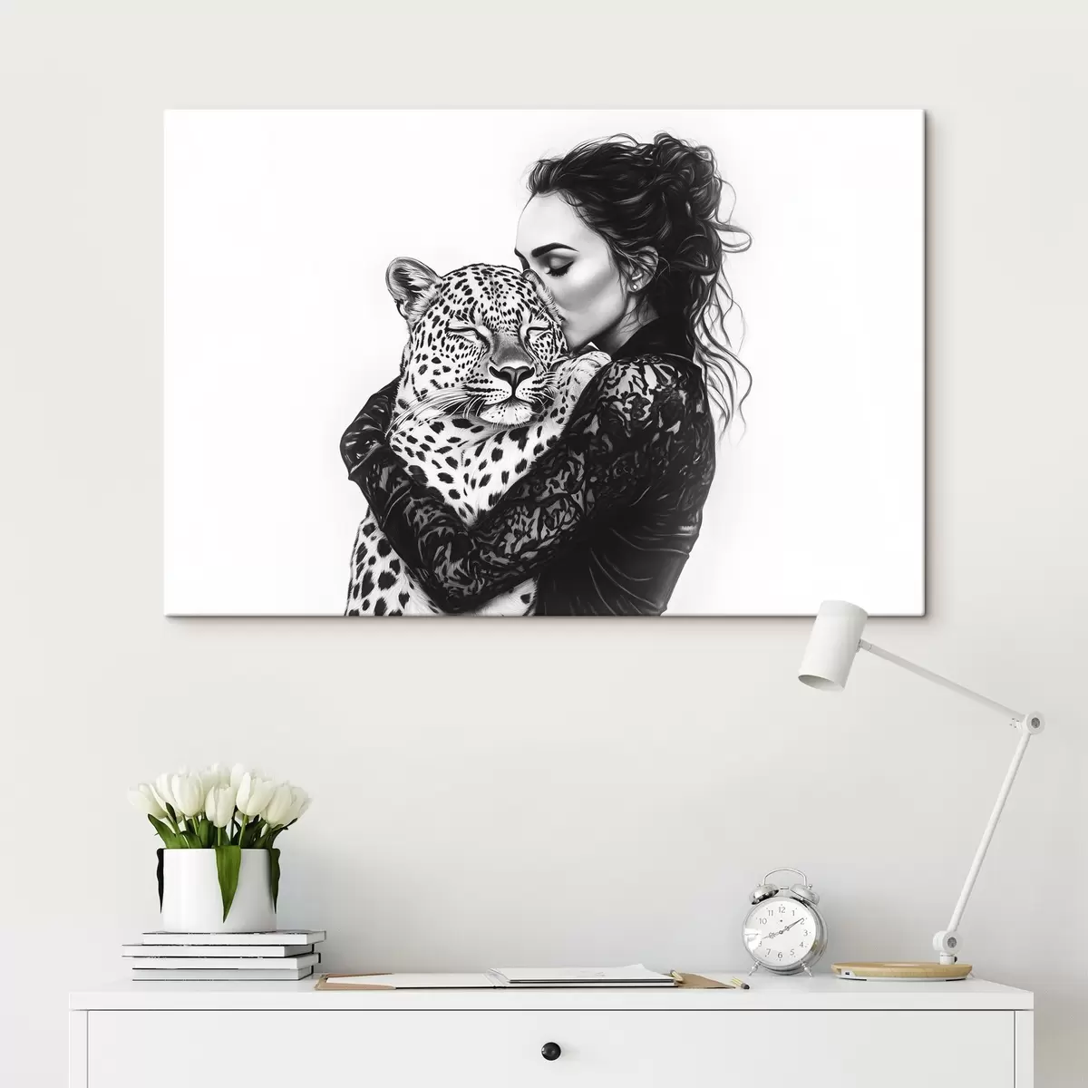 Картина Жінка цілує леопарда, малюнок олівцем, дикі тварини, чорно-білий Арт. s41457