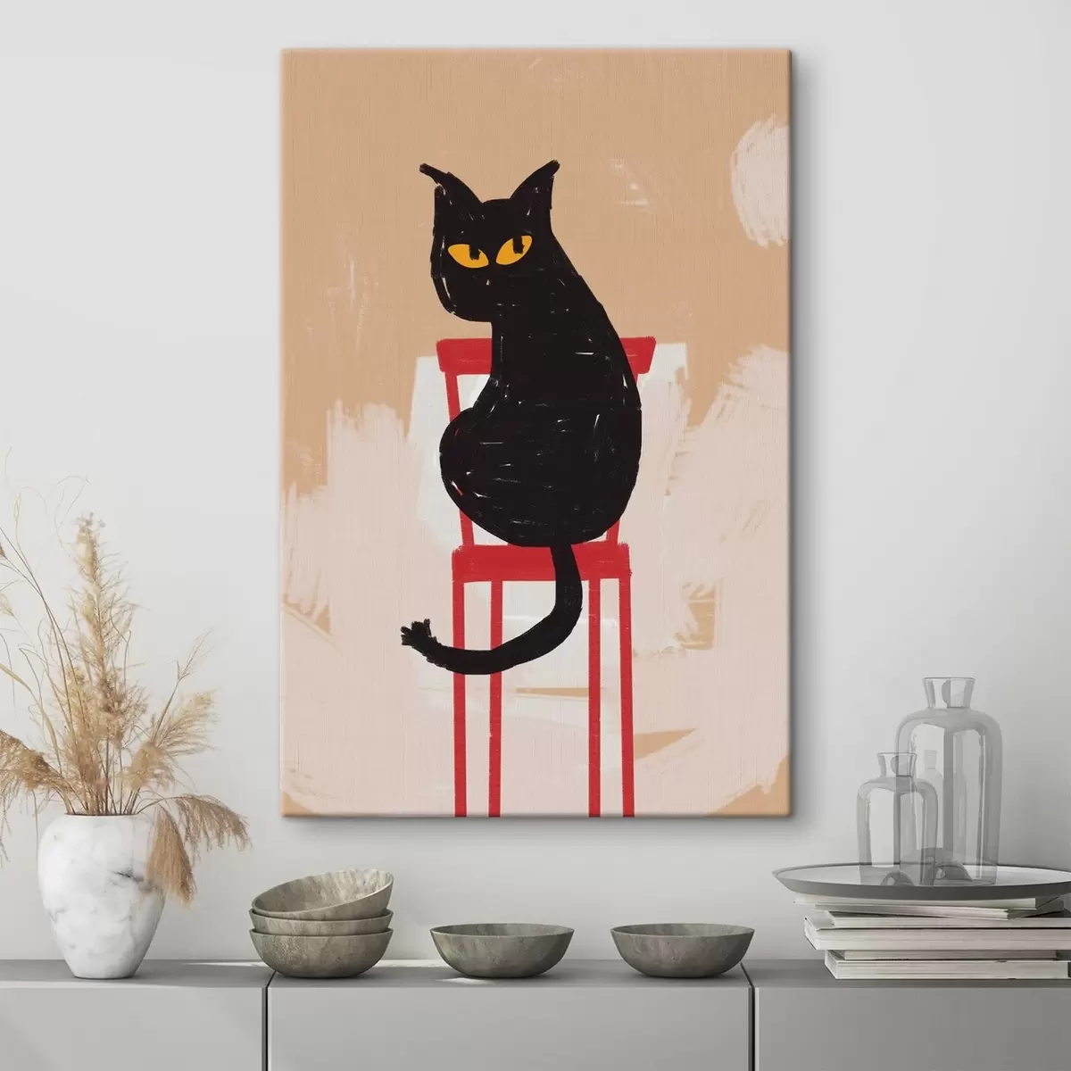 Картина Чорний кіт сидить на червоному стільці на бежевому тлі, грубі мазки, імітація живопису s41612