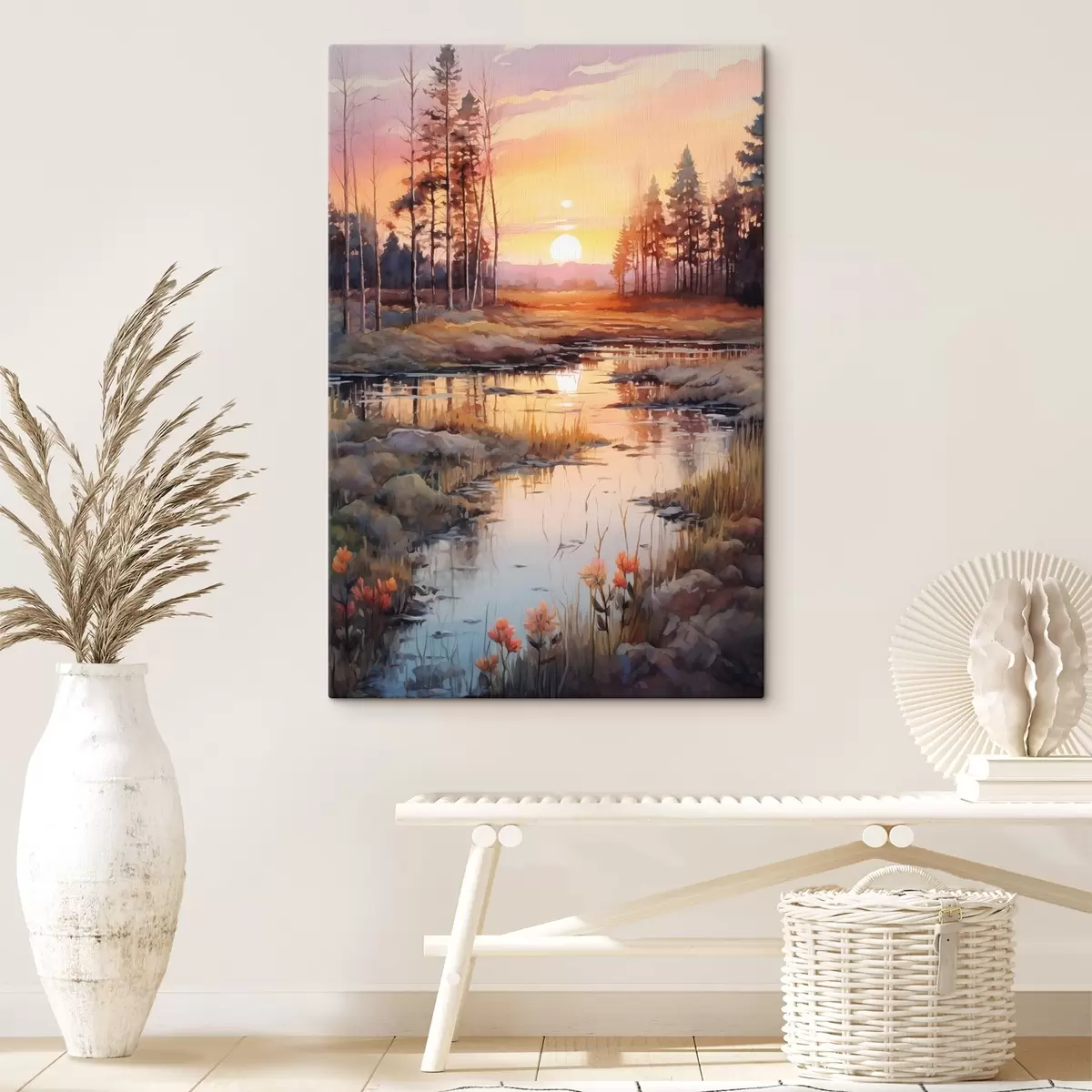 Картина Красива річка в осінньому лісі, акварель, луг, західне небо Арт. s41643
