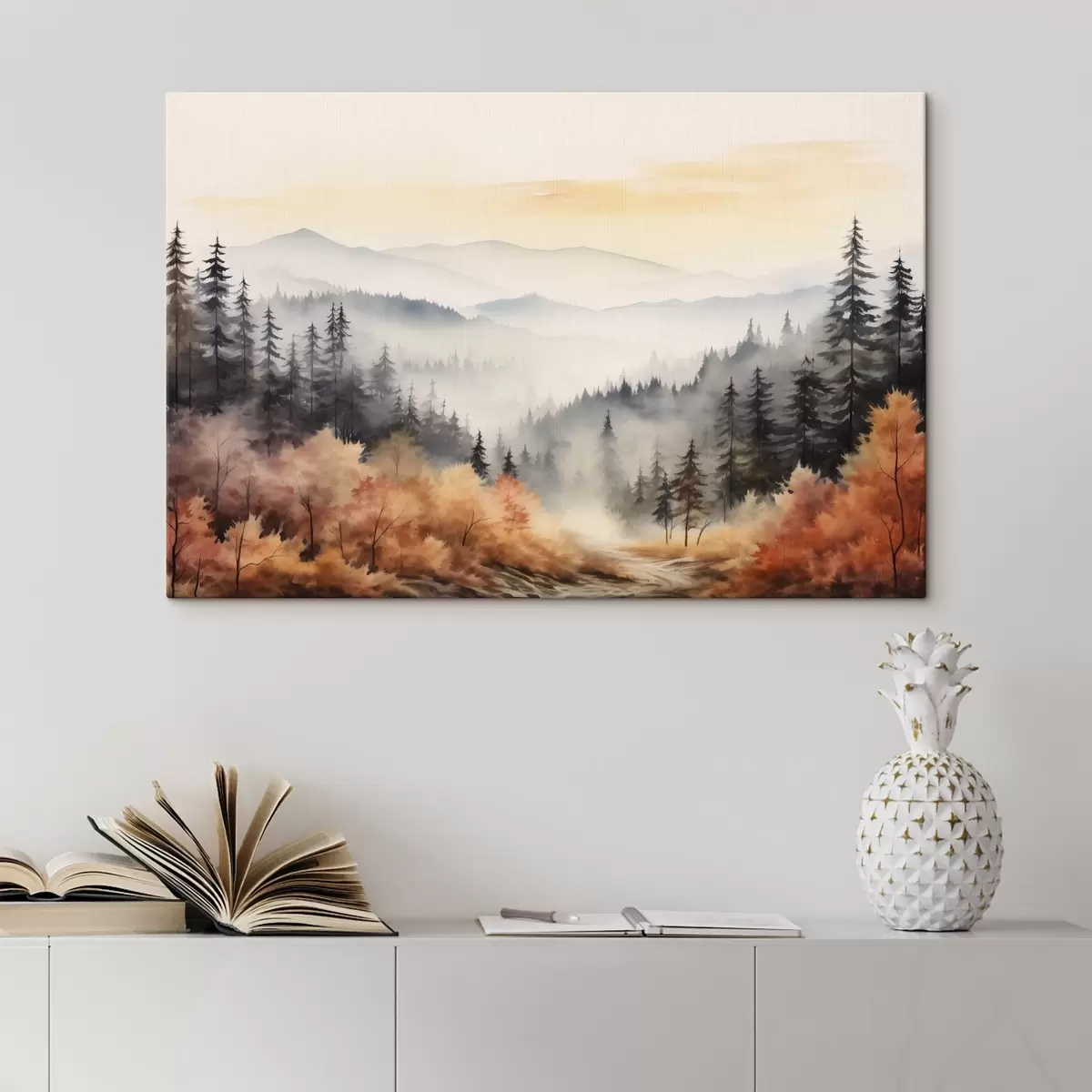 Картина Красиві туманні гори, осінній ліс, акварель Арт. s41646