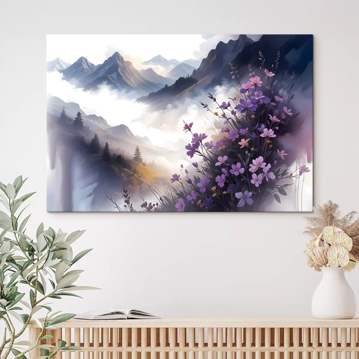 Картина Пейзаж з гірським хребтом на задньому плані, оточеним пишними фіолетовими квітами на передньому плані s41724