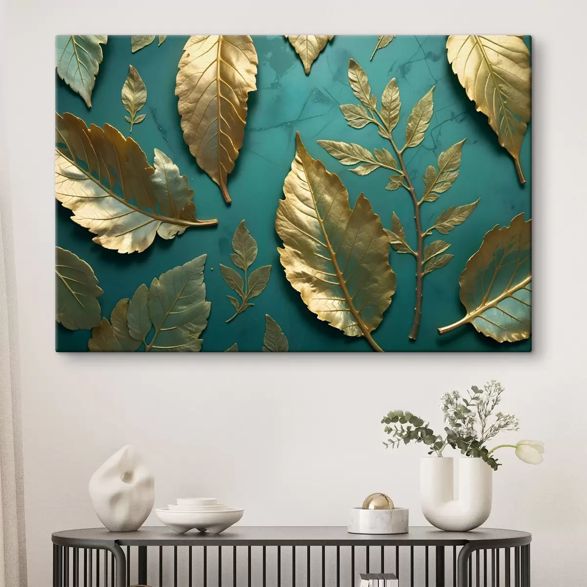 Картина Жовте ніжне листя на бірюзовому тлі створює елегантний ботанічний принт Арт. s41727