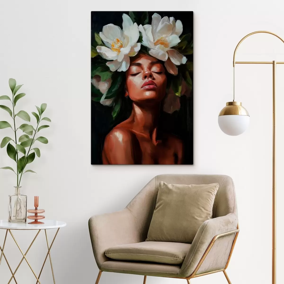 Картина Жіночий портрет з білими квітами у волоссі на темному тлі Арт. s41824