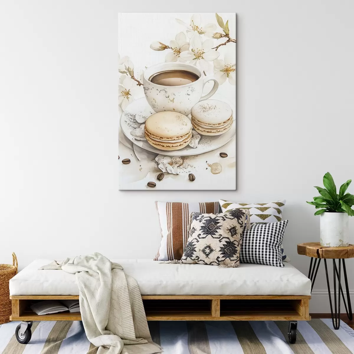 Картина Чашка кави з макарунами, акварельний стиль, м'які кольори, квіти жасмину Арт. s41949