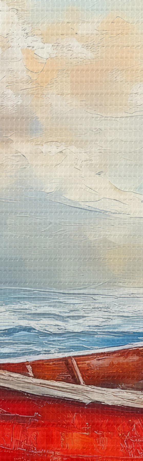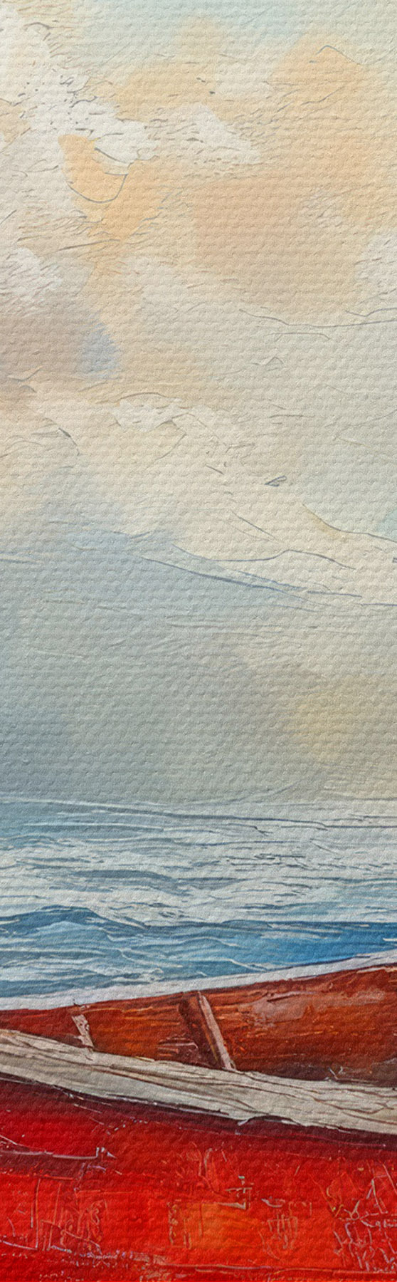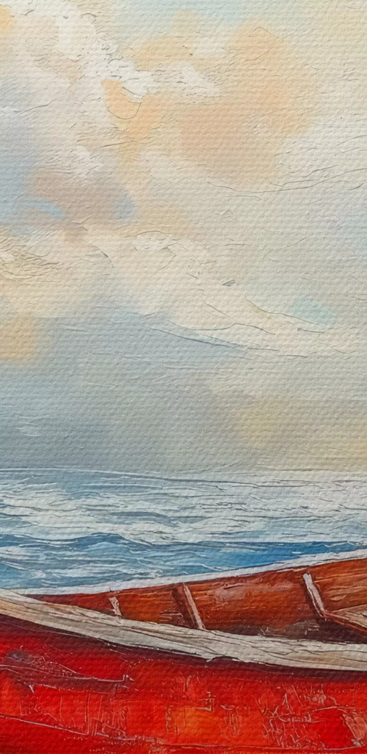 Картина червоний човен на березі моря в стилі олійних фарб s42009