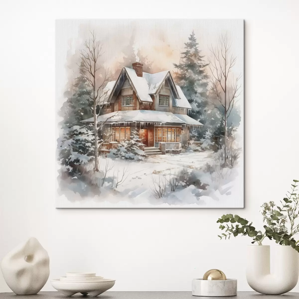 Картина Будинок у засніженому лісі, імітація акварелі s42137