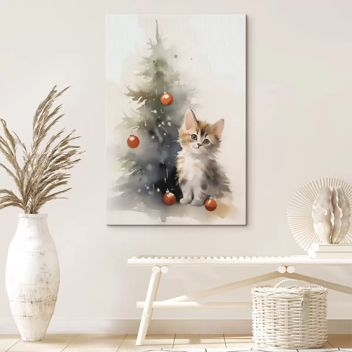 Картина Кошеня біля ялинки, імітація мокрої акварелі s42140